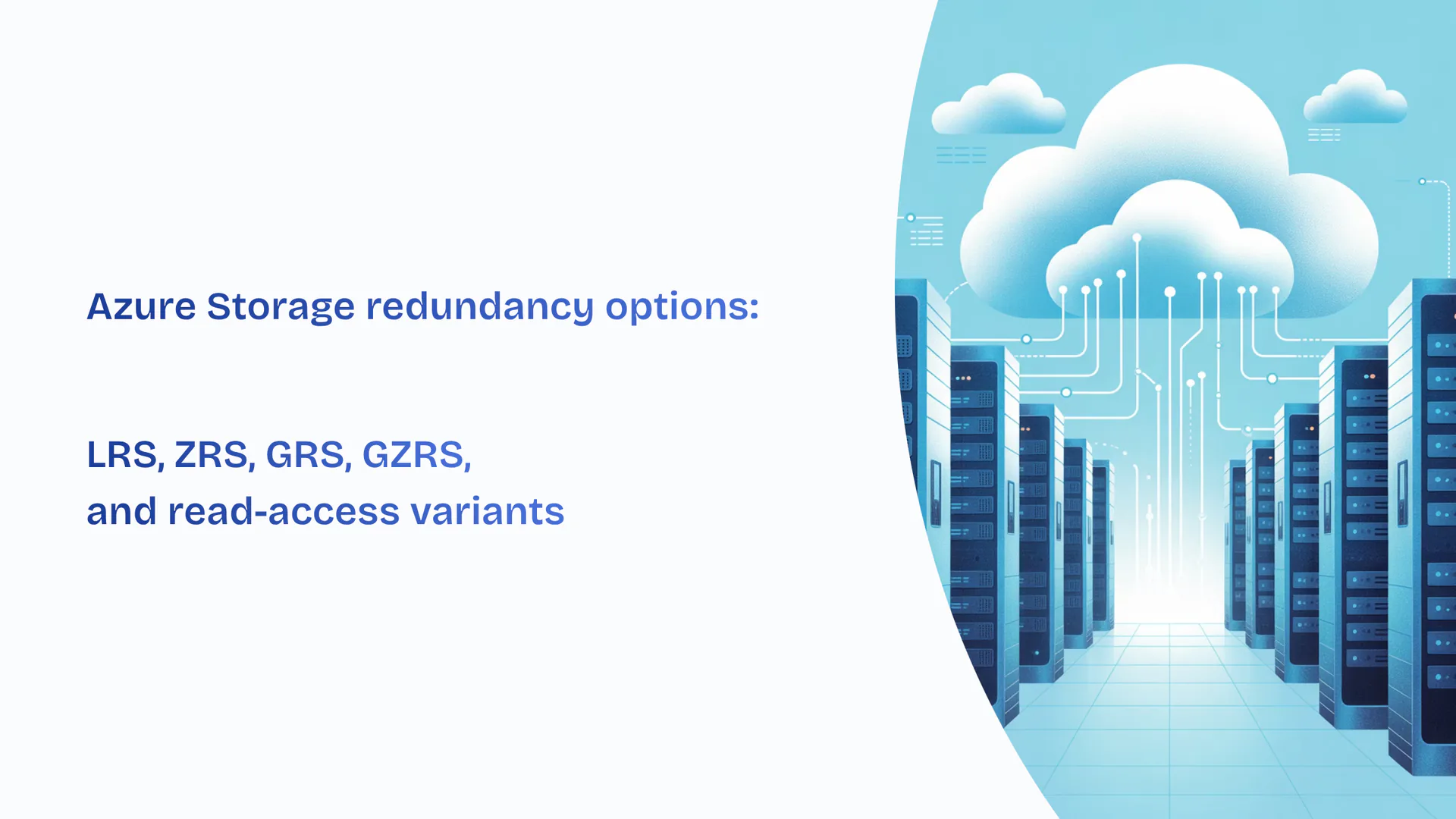 Azure Storage redundancy options: LRS, ZRS, GRS, GZRS, and read-access variantsIntroduction to Azure Storage redundancy options, covering different levels of data protection and availability.