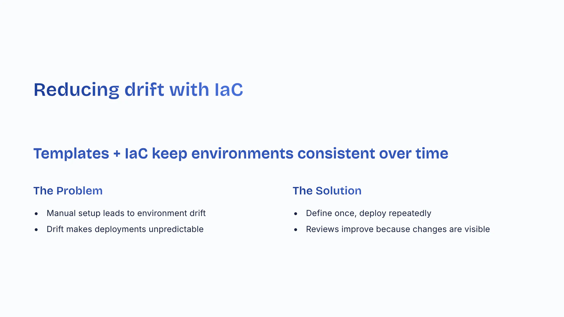 Reducing drift with IaCTemplates plus IaC keep environments consistent over time. Manual setup leads to environment drift. Drift makes deployments unpredictable. Define once, deploy repeatedly. Reviews improve because changes are visible.