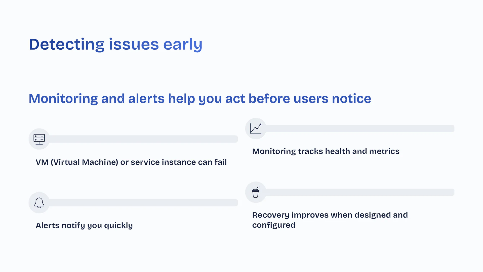 Detecting issues earlyMonitoring and alerts help you act before users notice. VM (Virtual Machine) or service instance can fail. Monitoring tracks health and metrics. Alerts notify you quickly. Recovery improves when designed and configured.