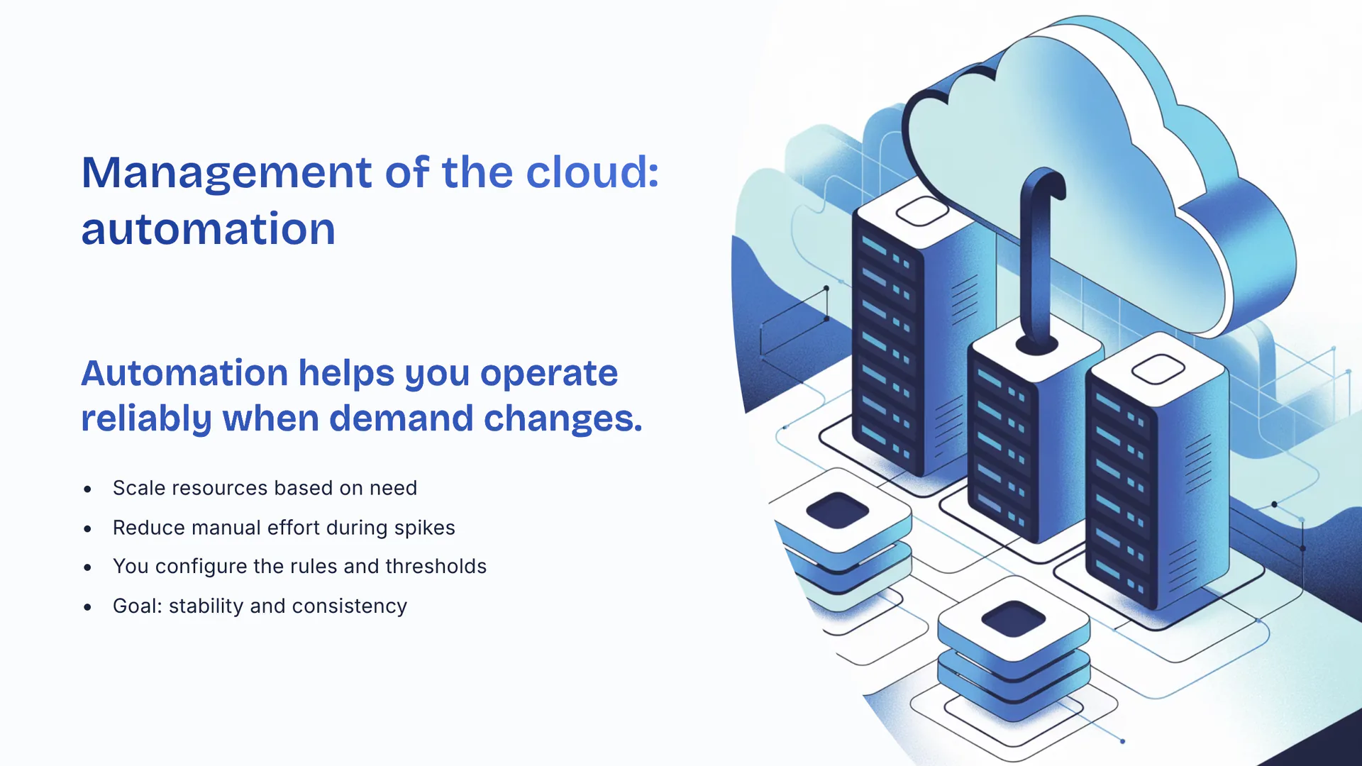 Management of the cloud: automationAutomation helps you operate reliably when demand changes. Scale resources based on need. Reduce manual effort during spikes. You configure the rules and thresholds. Goal: stability and consistency.