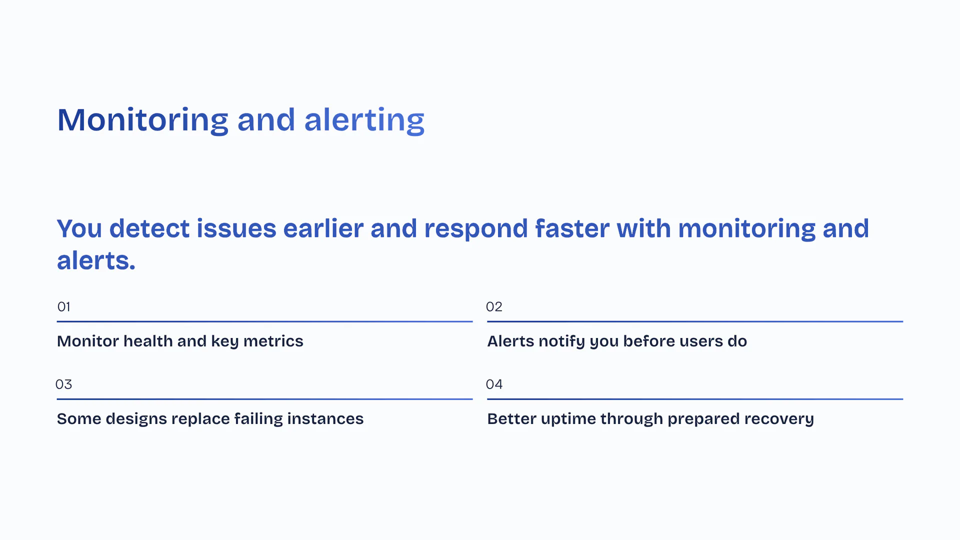 Monitoring and alertingYou detect issues earlier and respond faster with monitoring and alerts. Monitor health and key metrics. Alerts notify you before users do. Some designs replace failing instances. Better uptime through prepared recovery.