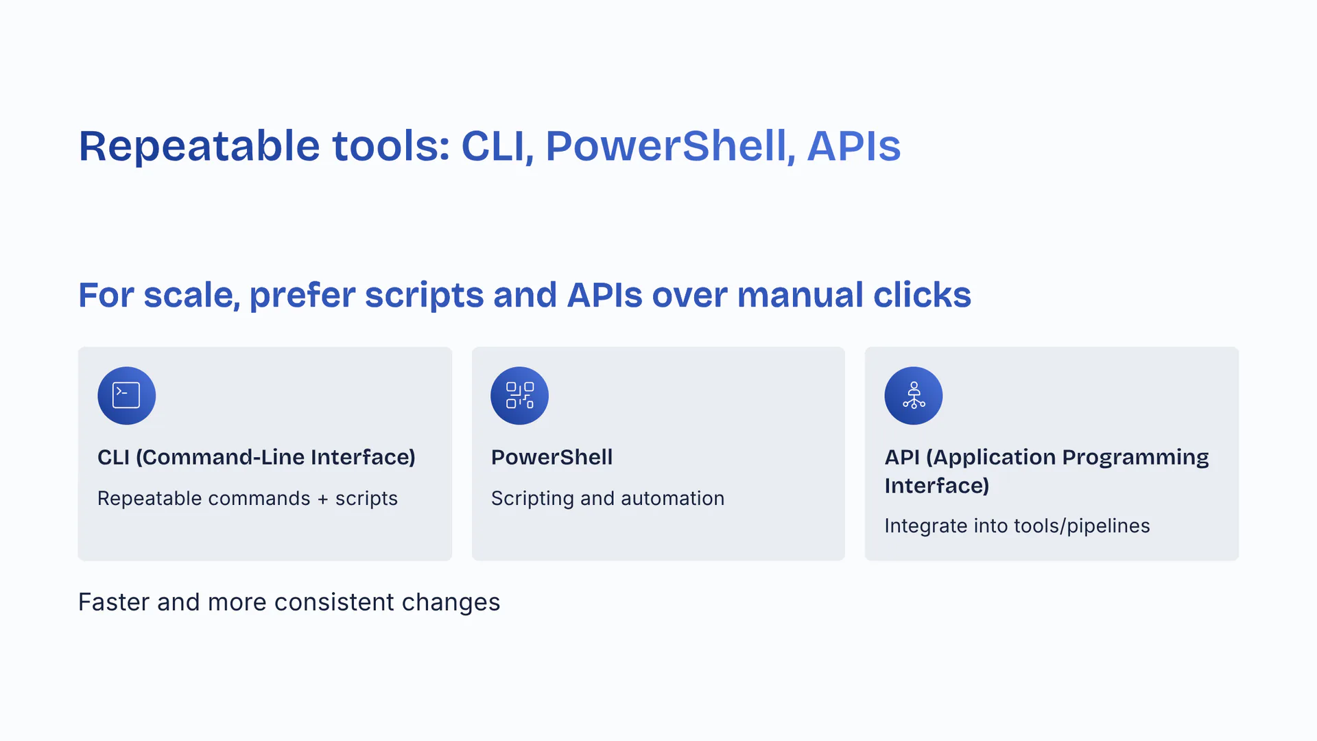 For scale, prefer scripts and APIs over manual clicks. CLI (Command-Line Interface): repeatable commands and scripts. PowerShell: scripting and automation. API (Application Programming Interface): integrate into tools and pipelines. Faster and more consistent changes.