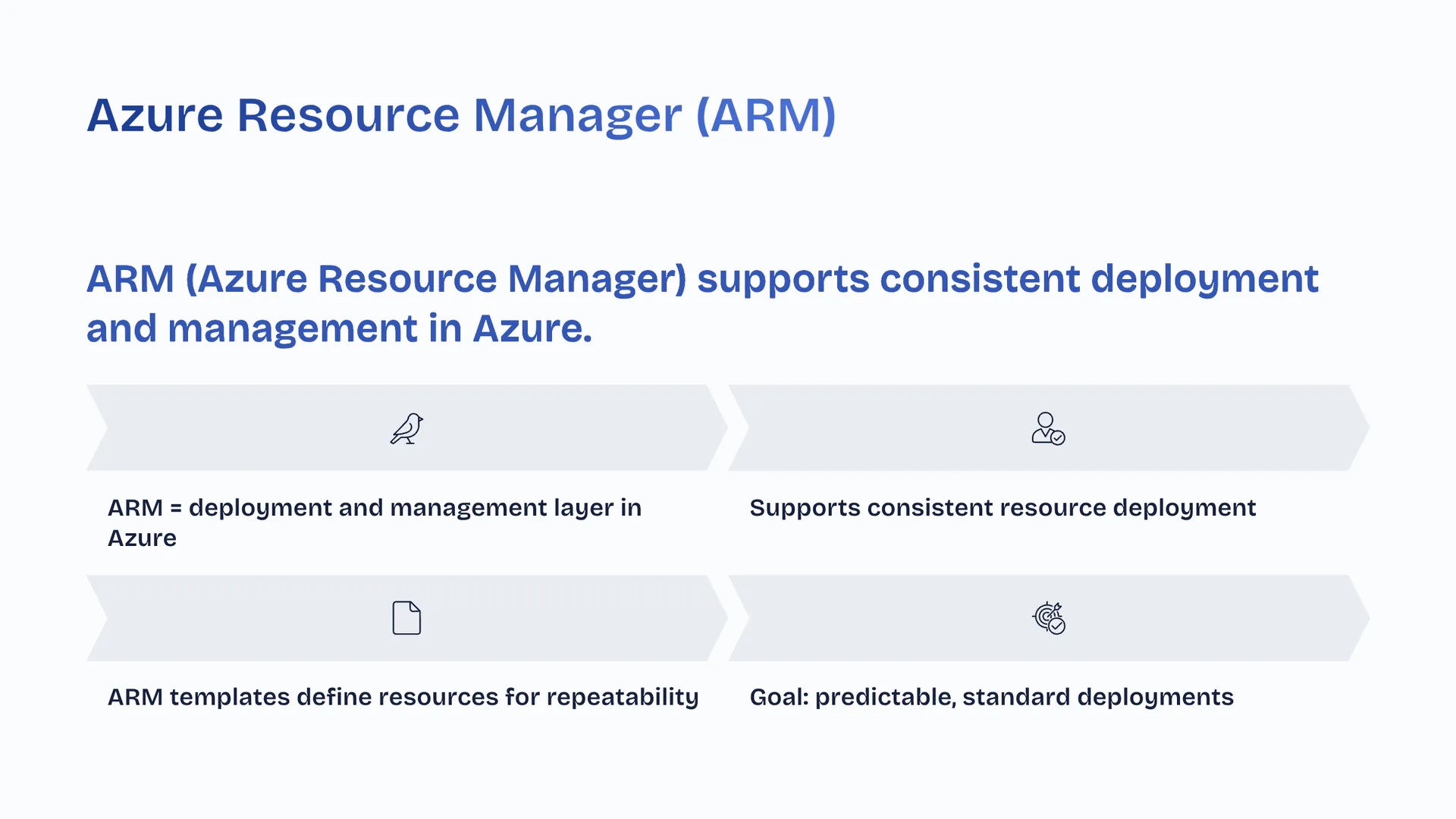 ARM (Azure Resource Manager) supports consistent deployment and management in Azure. ARM equals deployment and management layer in Azure. Supports consistent resource deployment. ARM templates define resources for repeatability. Goal: predictable, standard deployments.