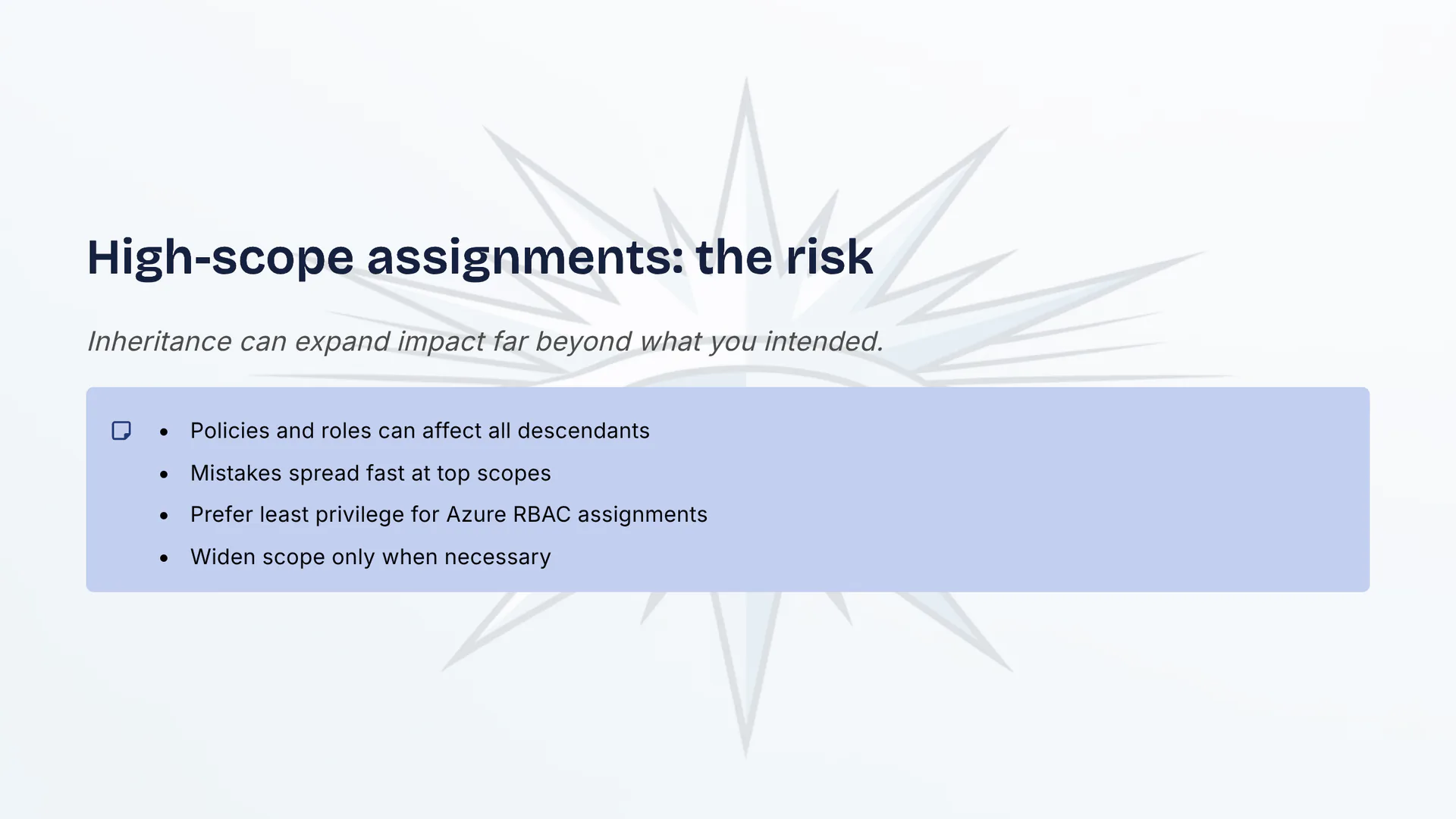 Inheritance can expand impact far beyond what you intended. Policies and roles can affect all descendants. Mistakes spread fast at top scopes. Prefer least privilege for Azure RBAC assignments. Widen scope only when necessary.