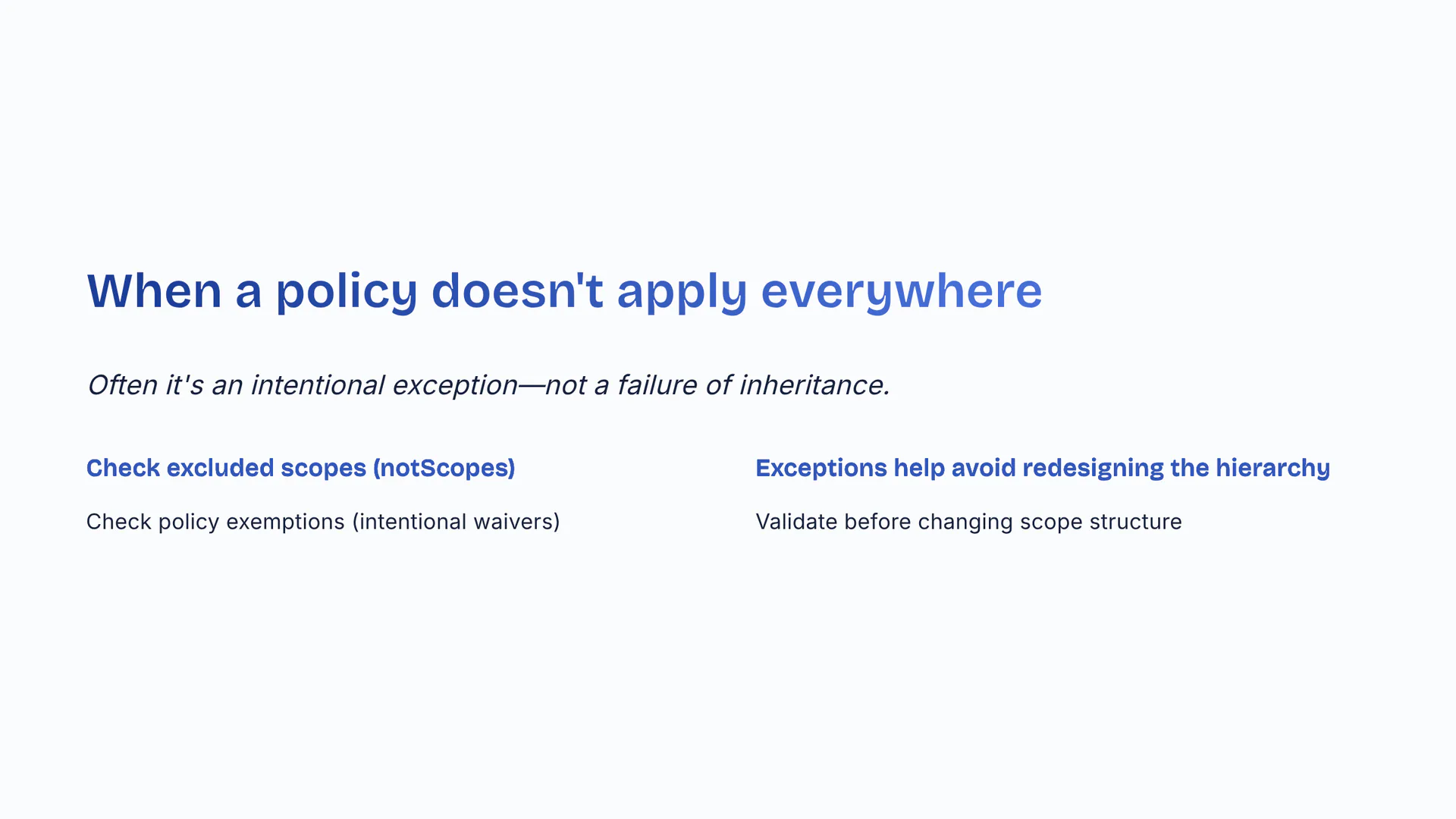 Often it's an intentional exception—not a failure of inheritance. Check excluded scopes (notScopes). Check policy exemptions (intentional waivers). Exceptions help avoid redesigning the hierarchy. Validate before changing scope structure.