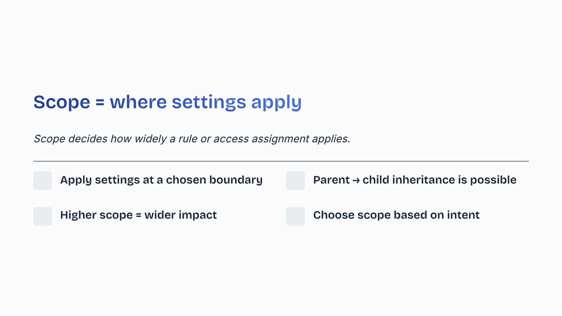 Scope = where settings applyScope decides how widely a rule or access assignment applies. Apply settings at a chosen boundary. Parent → child inheritance is possible. Higher scope equals wider impact. Choose scope based on intent.