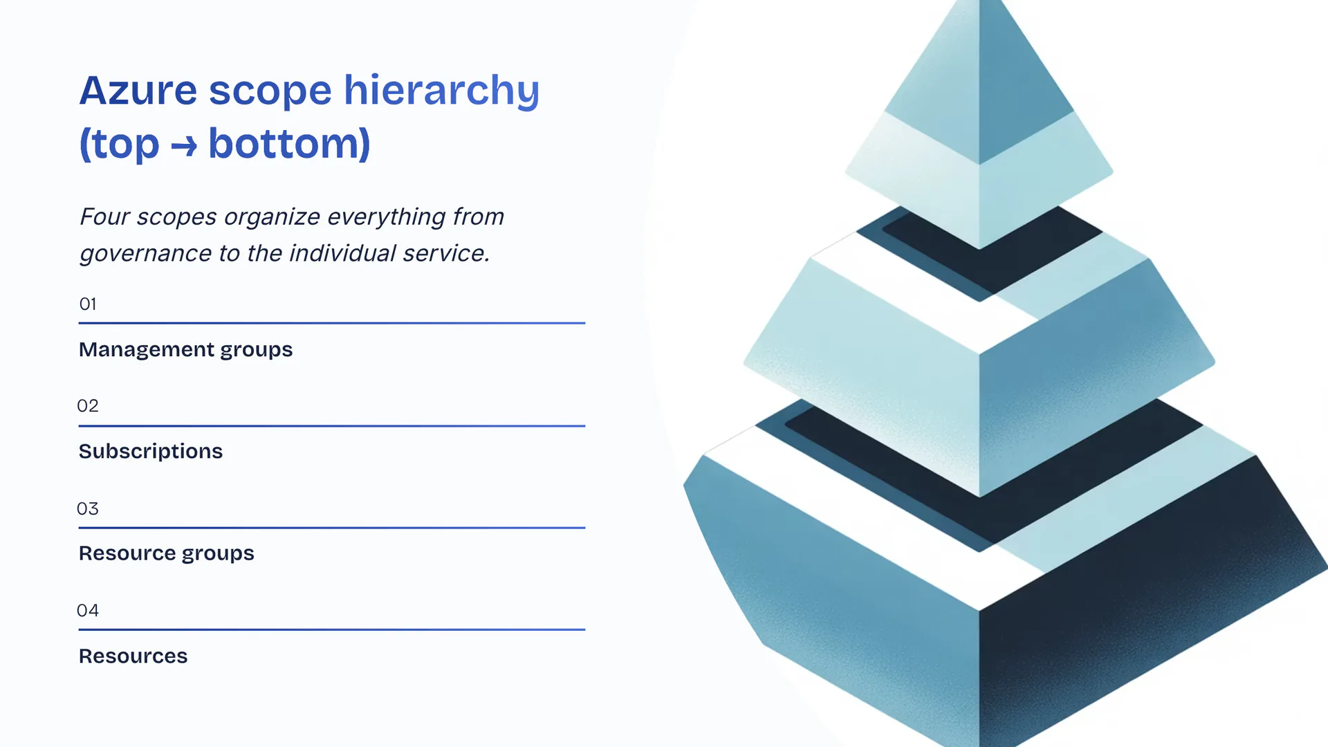 Azure scope hierarchy (top → bottom)Four scopes organize everything from governance to the individual service. Management groups. Subscriptions. Resource groups. Resources.