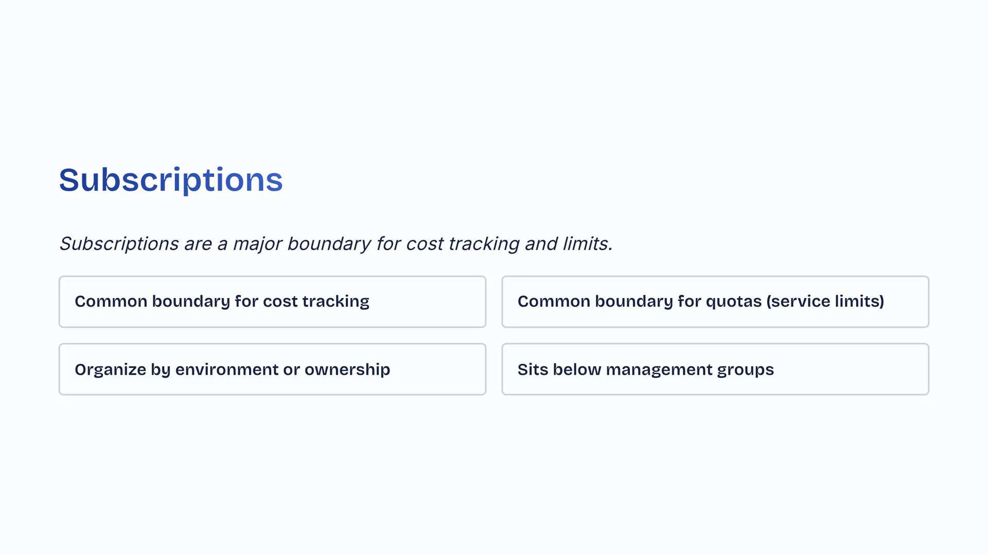 SubscriptionsSubscriptions are a major boundary for cost tracking and limits. Common boundary for cost tracking. Common boundary for quotas (service limits). Organize by environment or ownership. Sits below management groups.