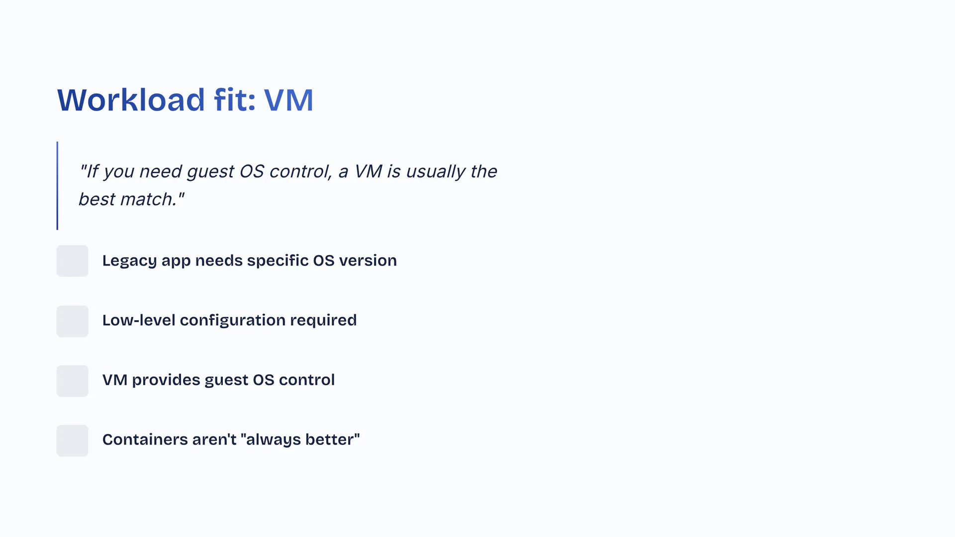 If you need guest OS control, a VM is usually the best match. Legacy app needs specific OS version. Low-level configuration required. VM provides guest OS control. Containers aren't 'always better'.