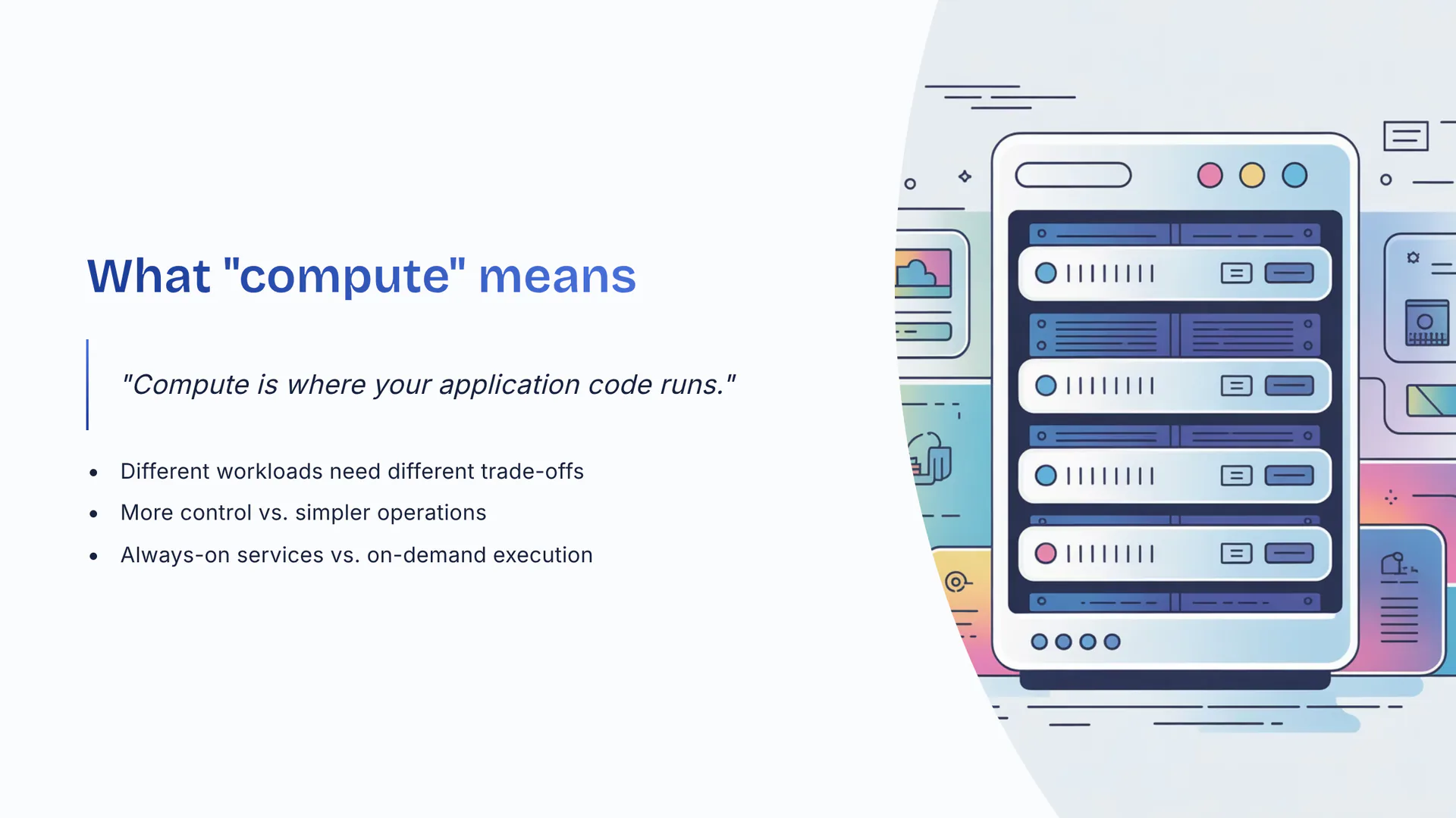 Compute is where your application code runs. Different workloads need different trade-offs. More control vs. simpler operations. Always-on services vs. on-demand execution.
