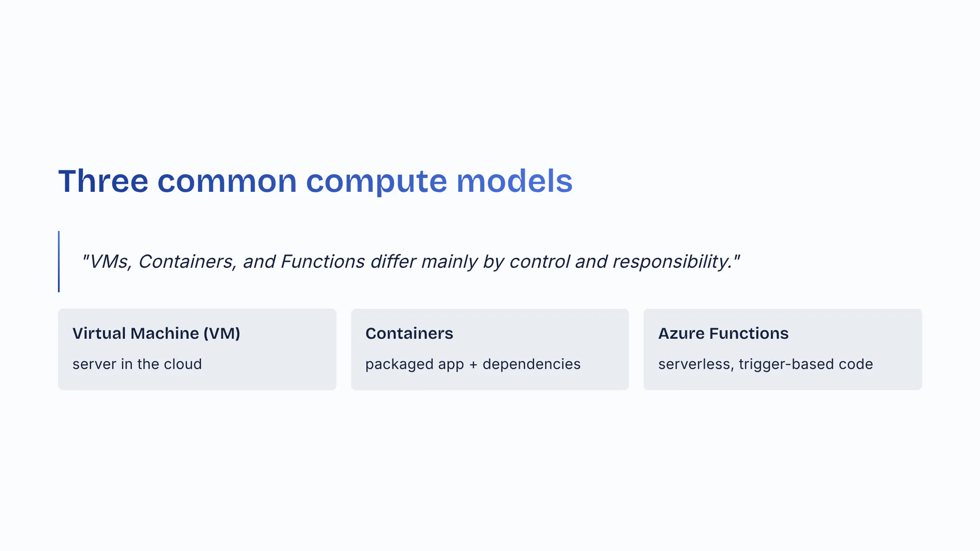 VMs, Containers, and Functions differ mainly by control and responsibility. Virtual Machine (VM): server in the cloud. Containers: packaged app plus dependencies. Azure Functions: serverless, trigger-based code.