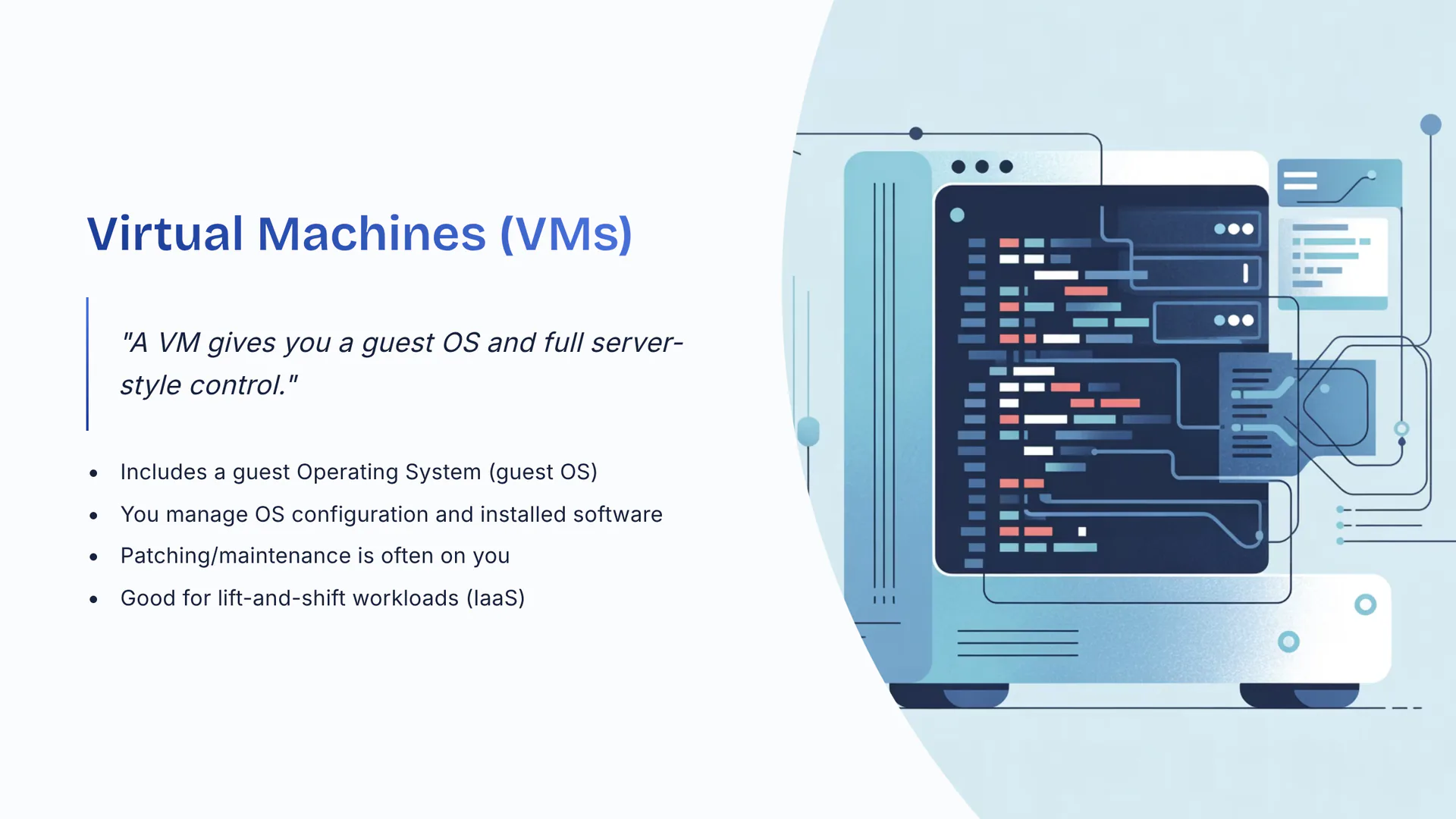 A VM gives you a guest OS and full server-style control. Includes a guest Operating System (guest OS). You manage OS configuration and installed software. Patching/maintenance is often on you. Good for lift-and-shift workloads (IaaS).