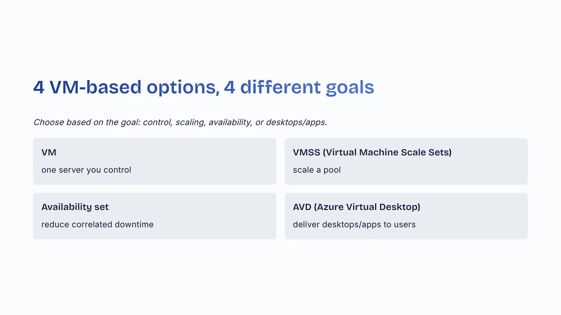 Choose based on the goal: control, scaling, availability, or desktops/apps. VM: one server you control. VMSS (Virtual Machine Scale Sets): scale a pool. Availability set: reduce correlated downtime. AVD (Azure Virtual Desktop): deliver desktops/apps to users.