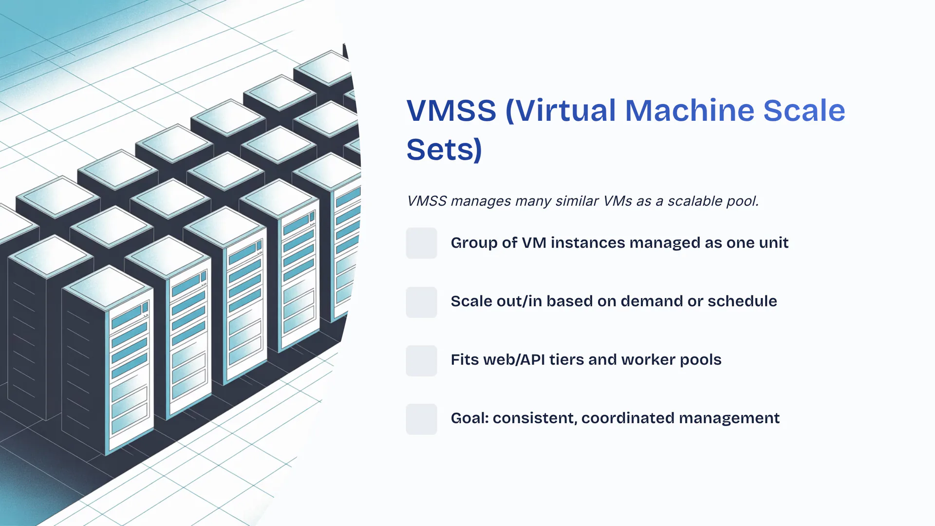 VMSS manages many similar VMs as a scalable pool. Group of VM instances managed as one unit. Scale out/in based on demand or schedule. Fits web/API tiers and worker pools. Goal: consistent, coordinated management.
