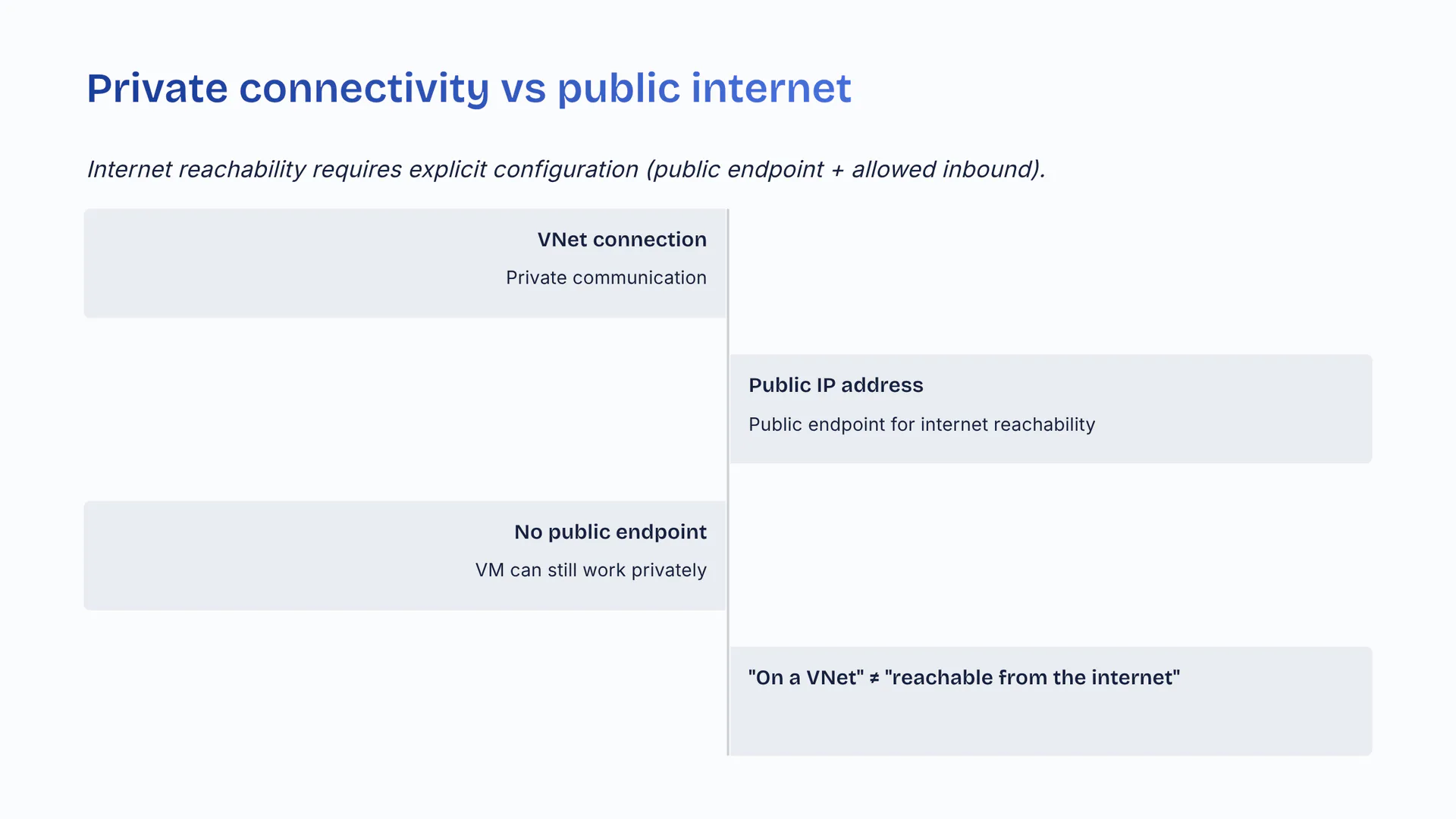 Internet reachability requires explicit configuration (public endpoint plus allowed inbound). VNet connection equals private communication. Public IP address equals public endpoint for internet reachability. No public endpoint → VM can still work privately. 'On a VNet' does not equal 'reachable from the internet'.