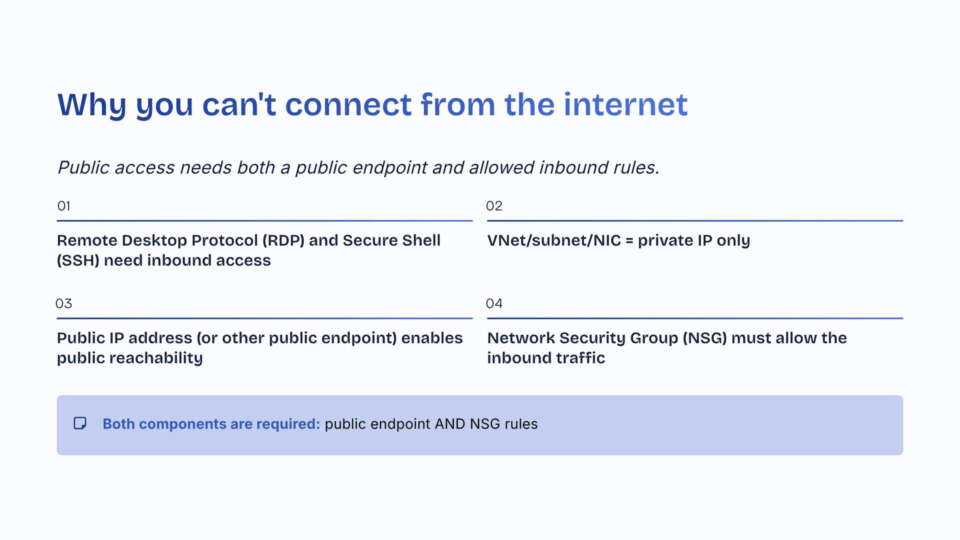 Public access needs both a public endpoint and allowed inbound rules. Remote Desktop Protocol (RDP) and Secure Shell (SSH) need inbound access. VNet/subnet/NIC equals private IP only. Public IP address (or other public endpoint) enables public reachability. Network Security Group (NSG) must allow the inbound traffic.