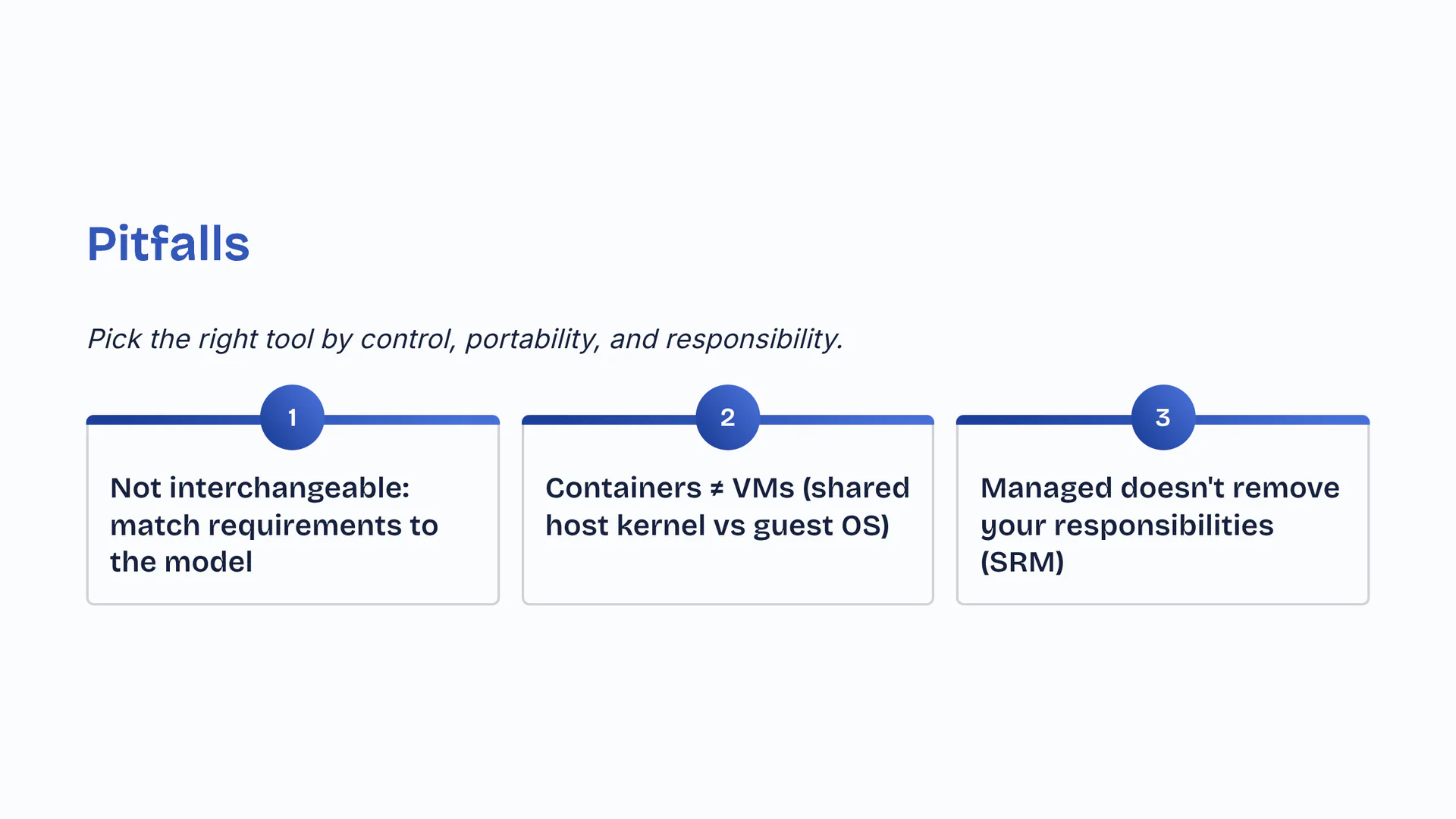 Pick the right tool by control, portability, and responsibility. Not interchangeable: match requirements to the model. Containers do not equal VMs (shared host kernel vs guest OS). Managed doesn't remove your responsibilities (SRM).