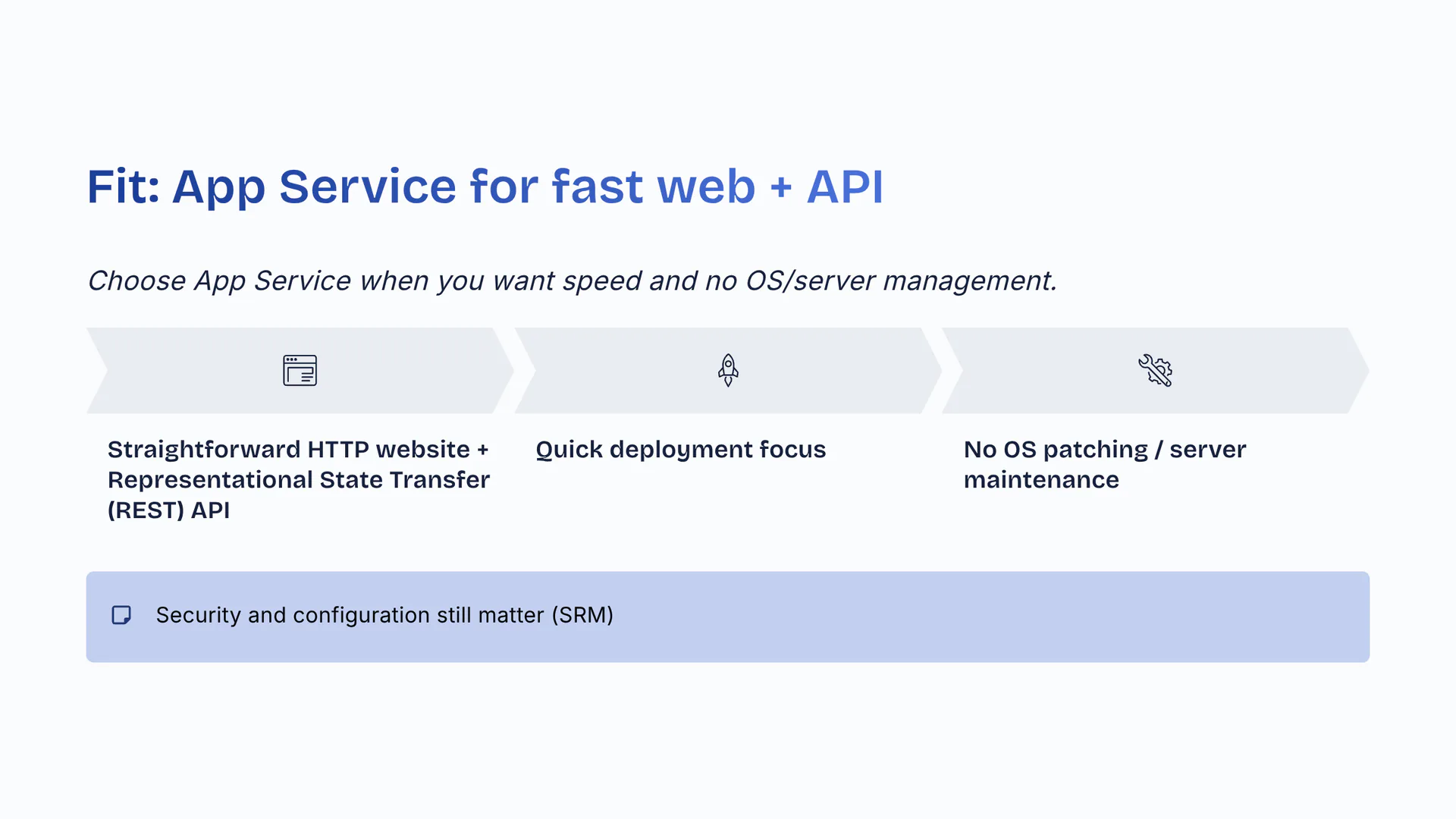 Choose App Service when you want speed and no OS/server management. Straightforward HTTP website plus Representational State Transfer (REST) API. Quick deployment focus. No OS patching / server maintenance. Security and configuration still matter (SRM).