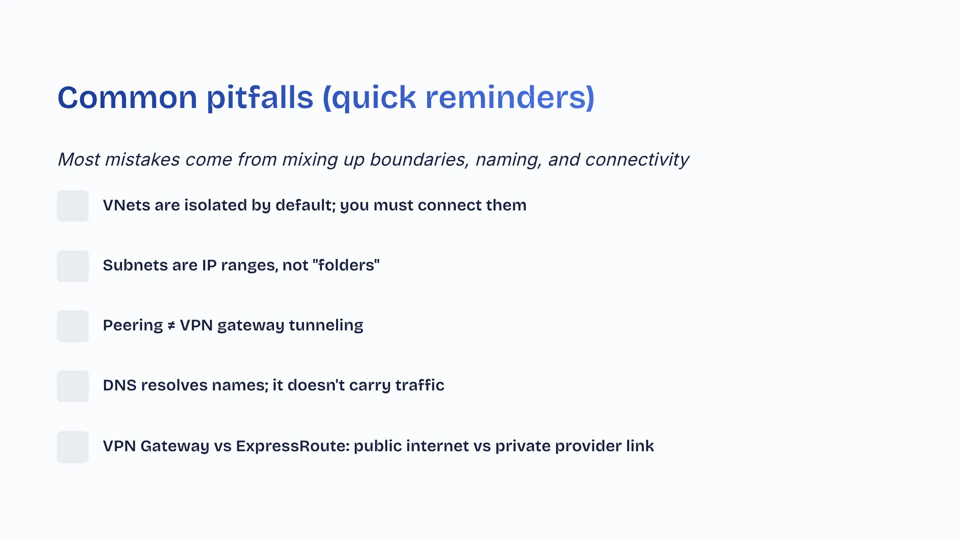 Most mistakes come from mixing up boundaries, naming, and connectivity. VNets are isolated by default; you must connect them. Subnets are IP ranges, not 'folders'. Peering does not equal VPN gateway tunneling. DNS resolves names; it doesn't carry traffic. VPN Gateway vs ExpressRoute: public internet vs private provider link.