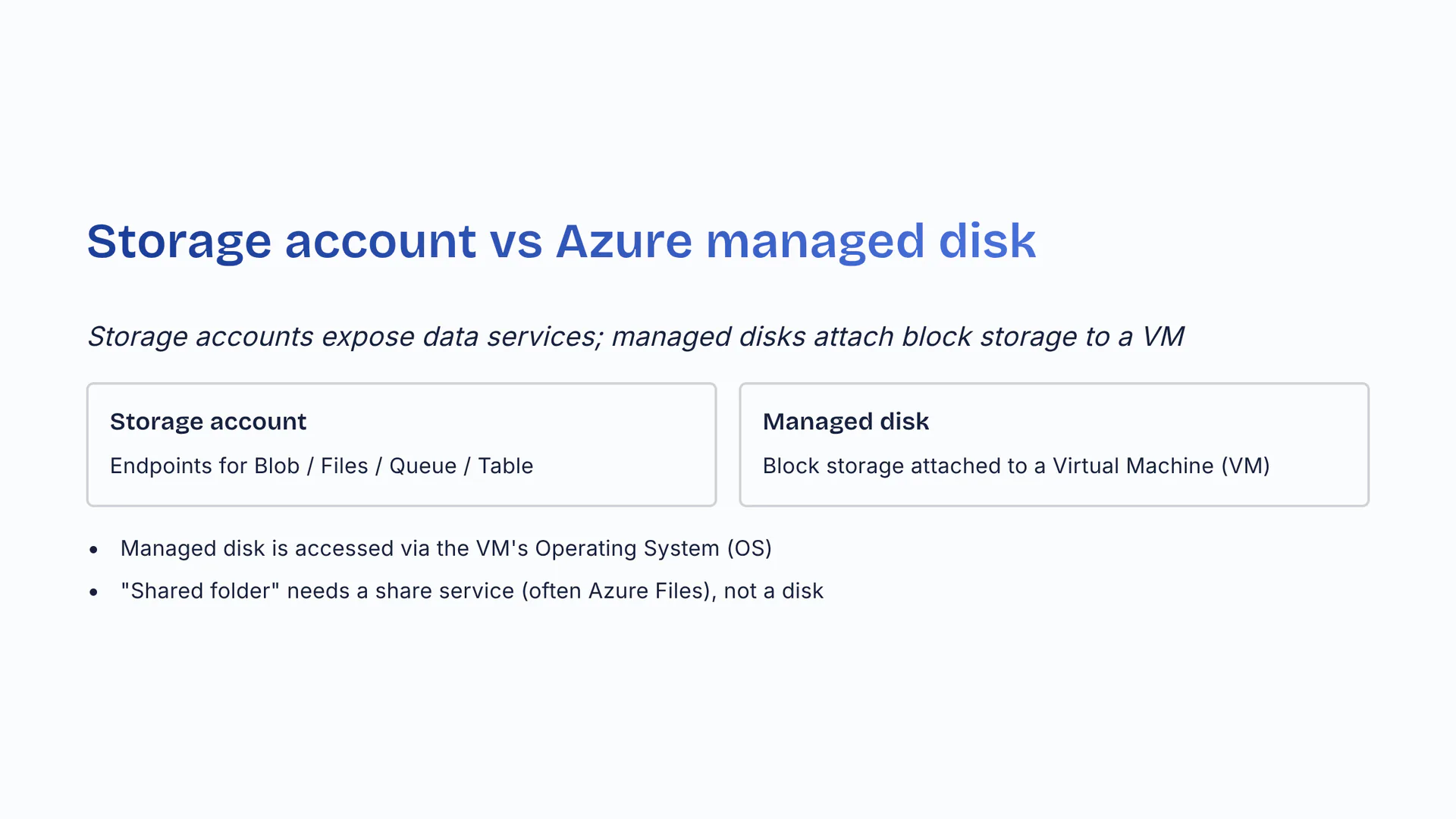 Storage accounts expose data services; managed disks attach block storage to a VM. Storage account: endpoints for Blob / Files / Queue / Table. Managed disk: block storage attached to a Virtual Machine (VM). Managed disk is accessed via the VM's Operating System (OS). 'Shared folder' needs a share service (often Azure Files), not a disk.