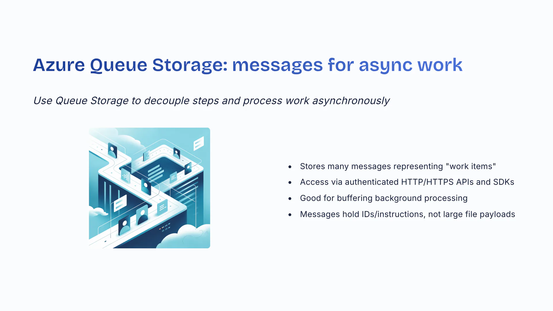 Use Queue Storage to decouple steps and process work asynchronously. Stores many messages representing 'work items'. Access via authenticated HTTP/HTTPS APIs and SDKs. Good for buffering background processing. Messages hold IDs/instructions, not large file payloads.