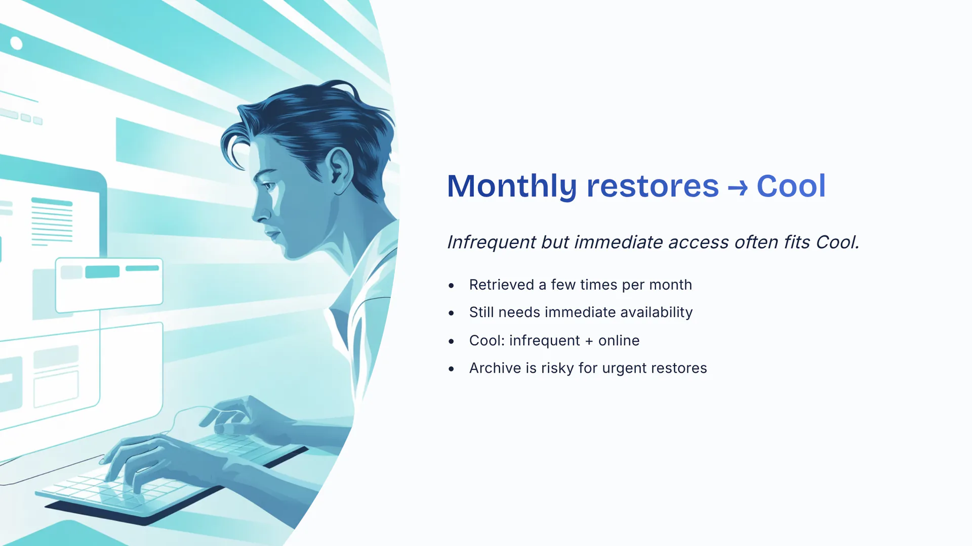 Infrequent but immediate access often fits Cool. Retrieved a few times per month. Still needs immediate availability. Cool: infrequent plus online. Archive is risky for urgent restores.