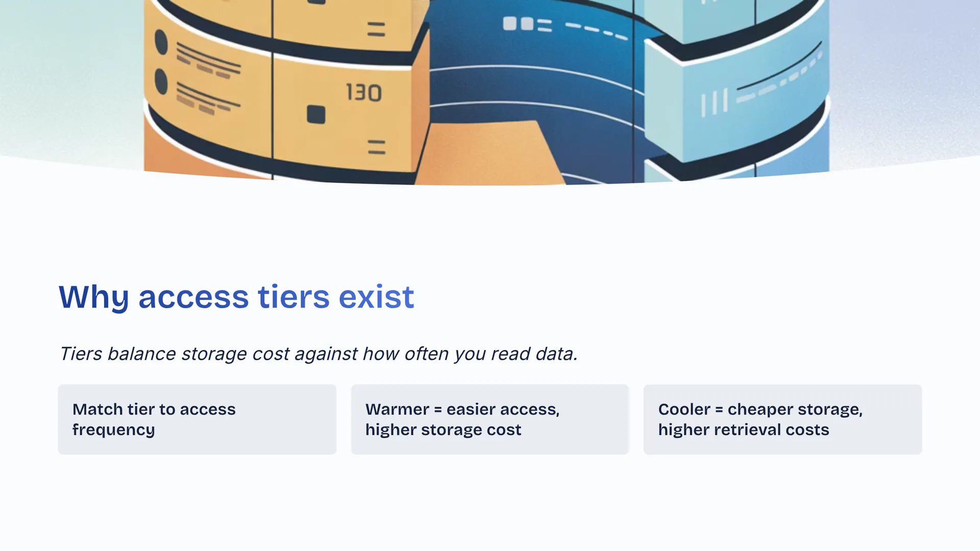 Tiers balance storage cost against how often you read data. Match tier to access frequency. Warmer equals easier access, higher storage cost. Cooler equals cheaper storage, higher retrieval costs.