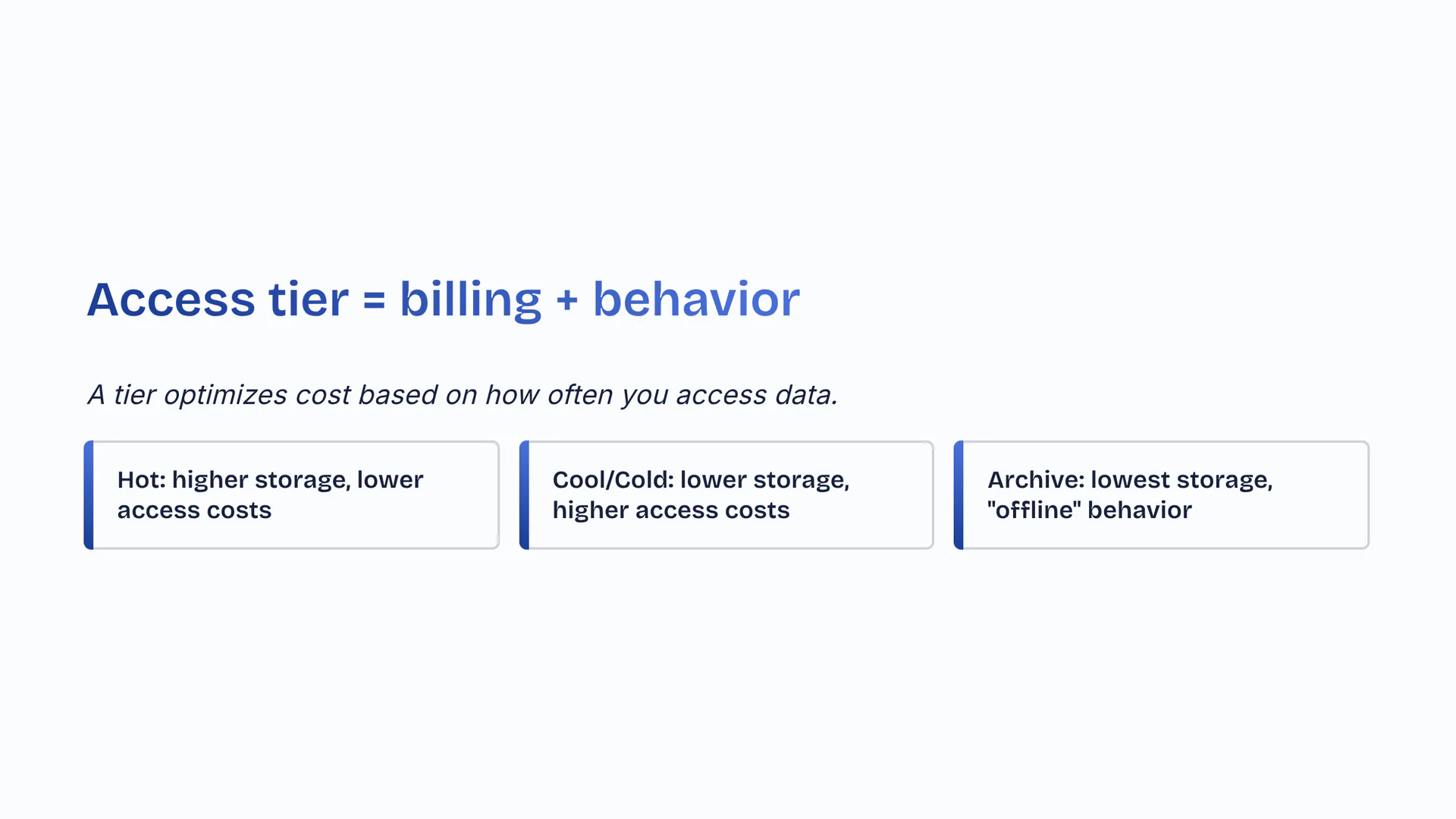 A tier optimizes cost based on how often you access data. Hot: higher storage, lower access costs. Cool/Cold: lower storage, higher access costs. Archive: lowest storage, 'offline' behavior.
