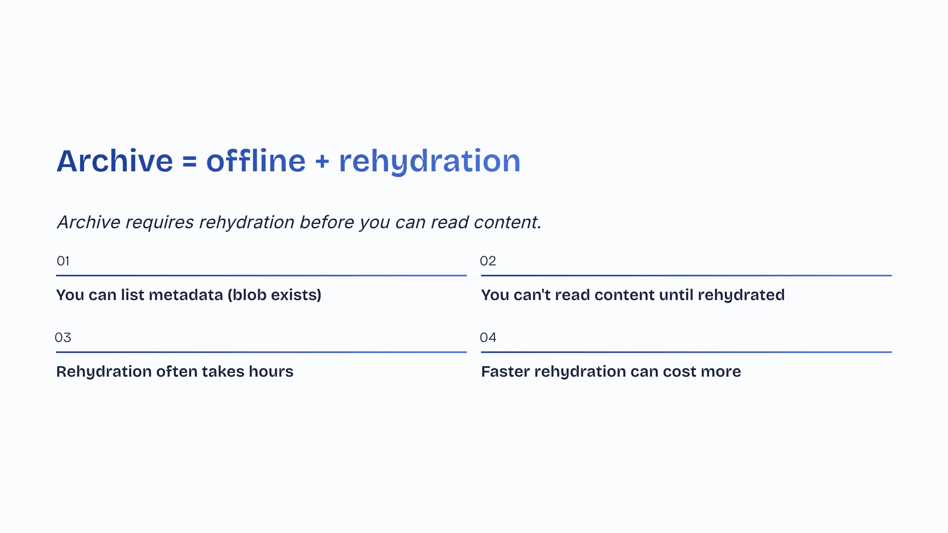 Archive requires rehydration before you can read content. You can list metadata (blob exists). You can't read content until rehydrated. Rehydration often takes hours. Faster rehydration can cost more.