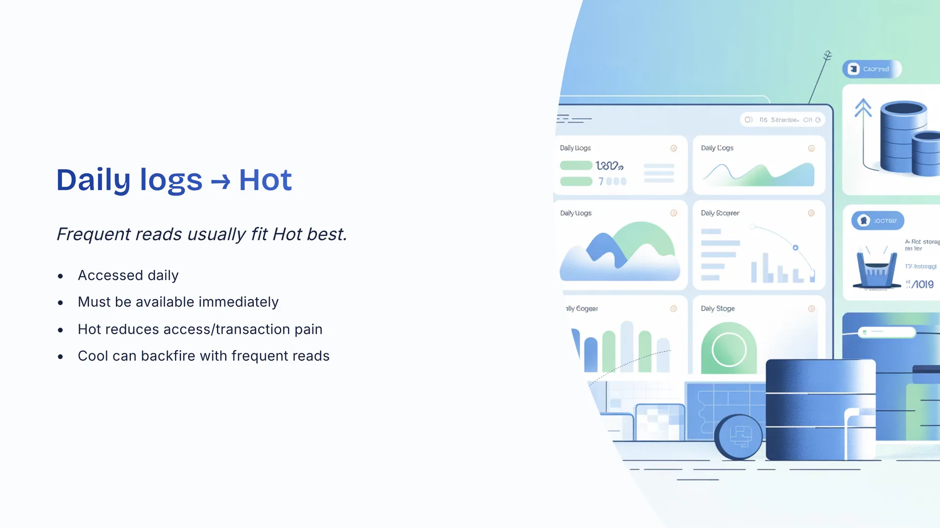 Frequent reads usually fit Hot best. Accessed daily. Must be available immediately. Hot reduces access/transaction pain. Cool can backfire with frequent reads.