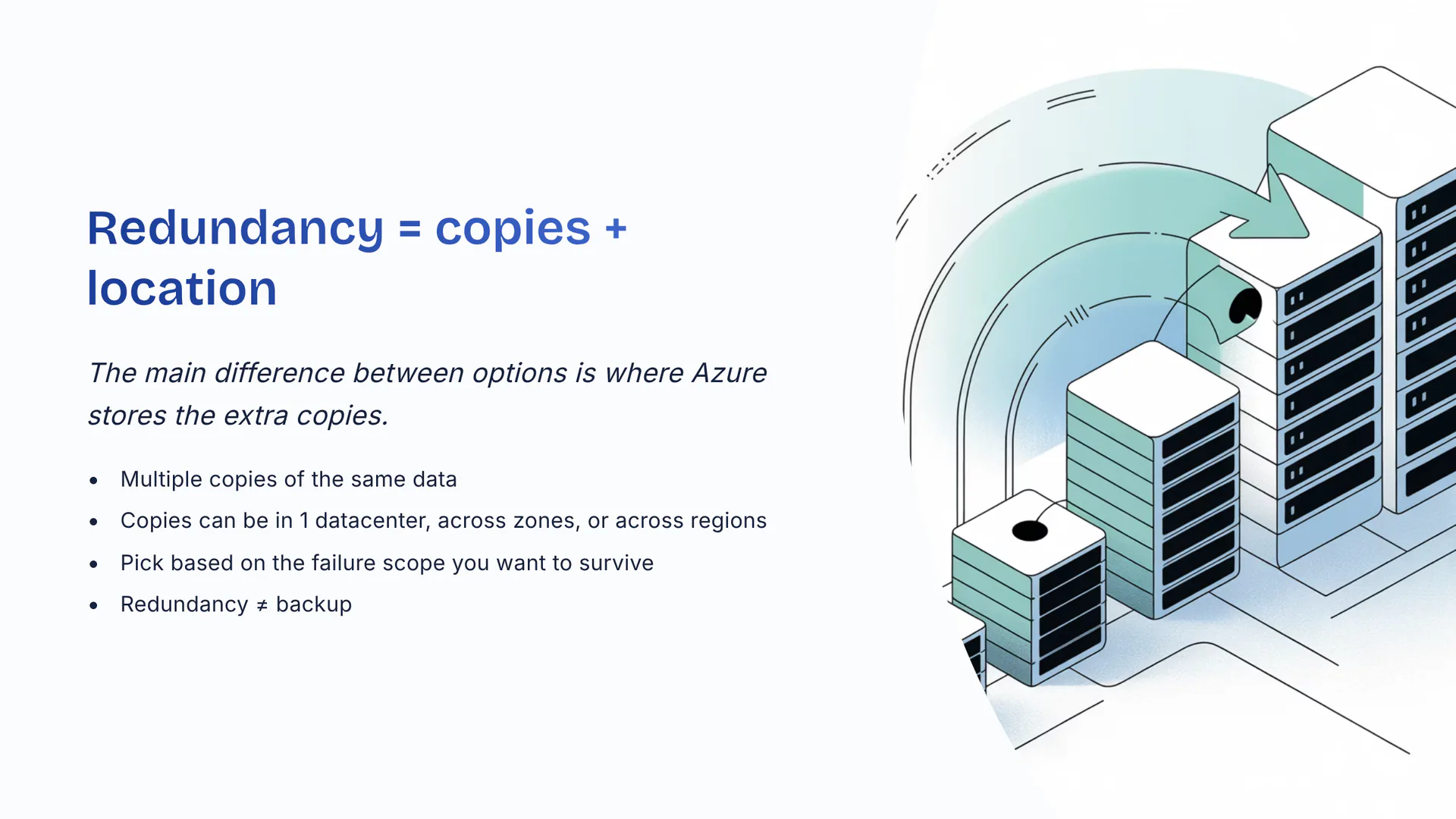 The main difference between options is where Azure stores the extra copies. Multiple copies of the same data. Copies can be in 1 datacenter, across zones, or across regions. Pick based on the failure scope you want to survive. Redundancy does not equal backup.