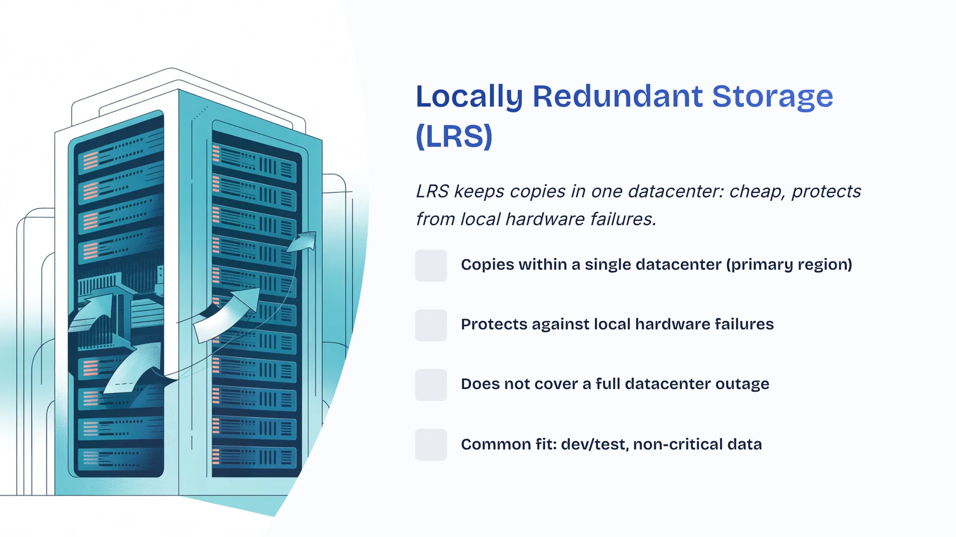 LRS keeps copies in one datacenter: cheap, protects from local hardware failures. Copies within a single datacenter (primary region). Protects against local hardware failures. Does not cover a full datacenter outage. Common fit: dev/test, non-critical data.