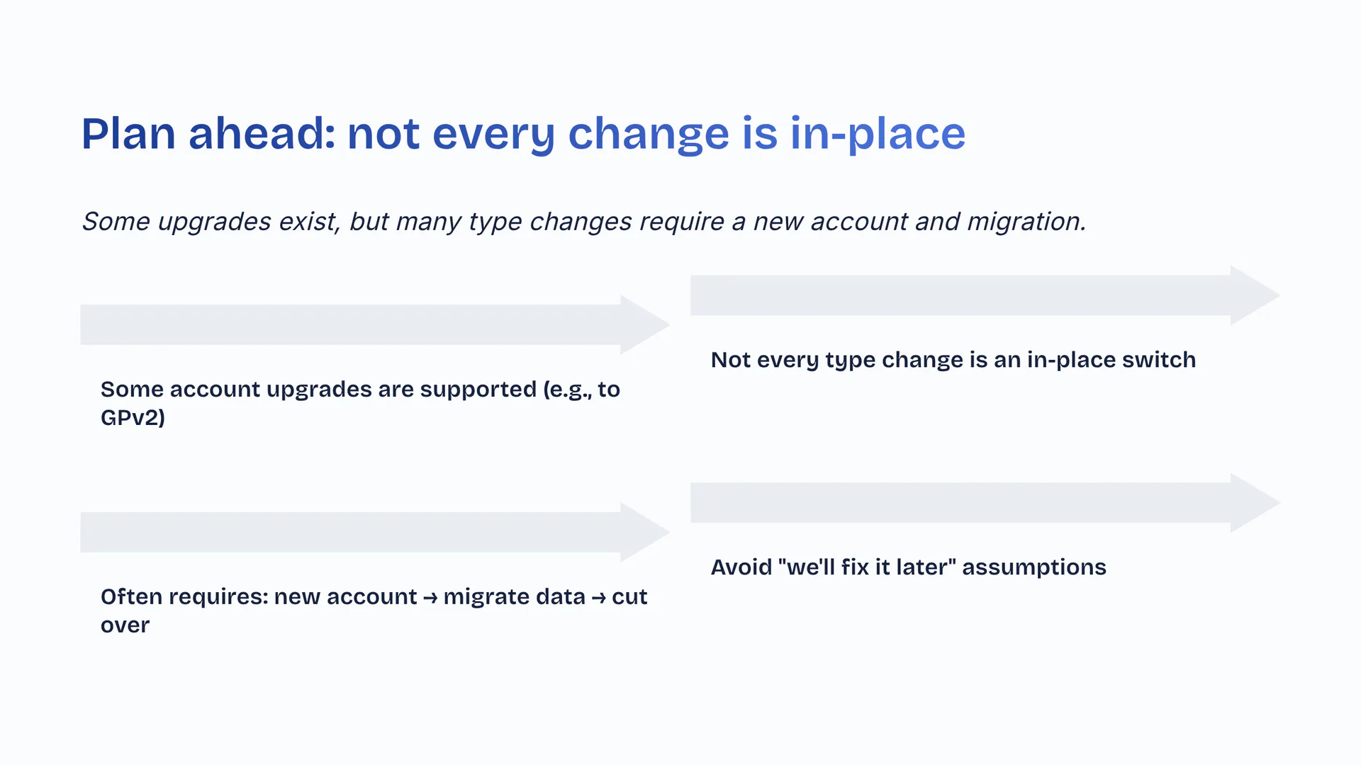 Some upgrades exist, but many type changes require a new account and migration. Some account upgrades are supported (e.g., to GPv2). Not every type change is an in-place switch. Often requires: new account → migrate data → cut over. Avoid 'we'll fix it later' assumptions.