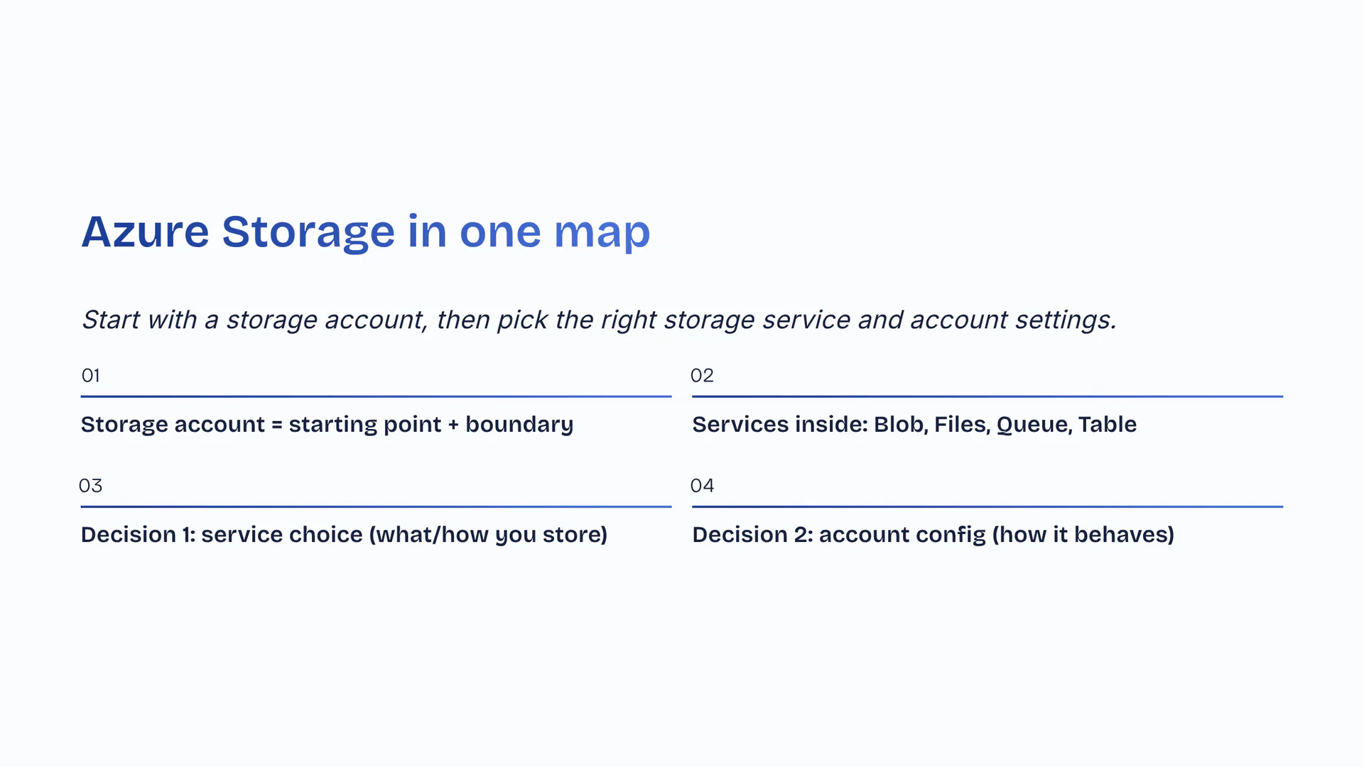 Start with a storage account, then pick the right storage service and account settings. Storage account equals starting point plus boundary. Services inside: Blob, Files, Queue, Table. Decision 1: service choice (what/how you store). Decision 2: account config (how it behaves).