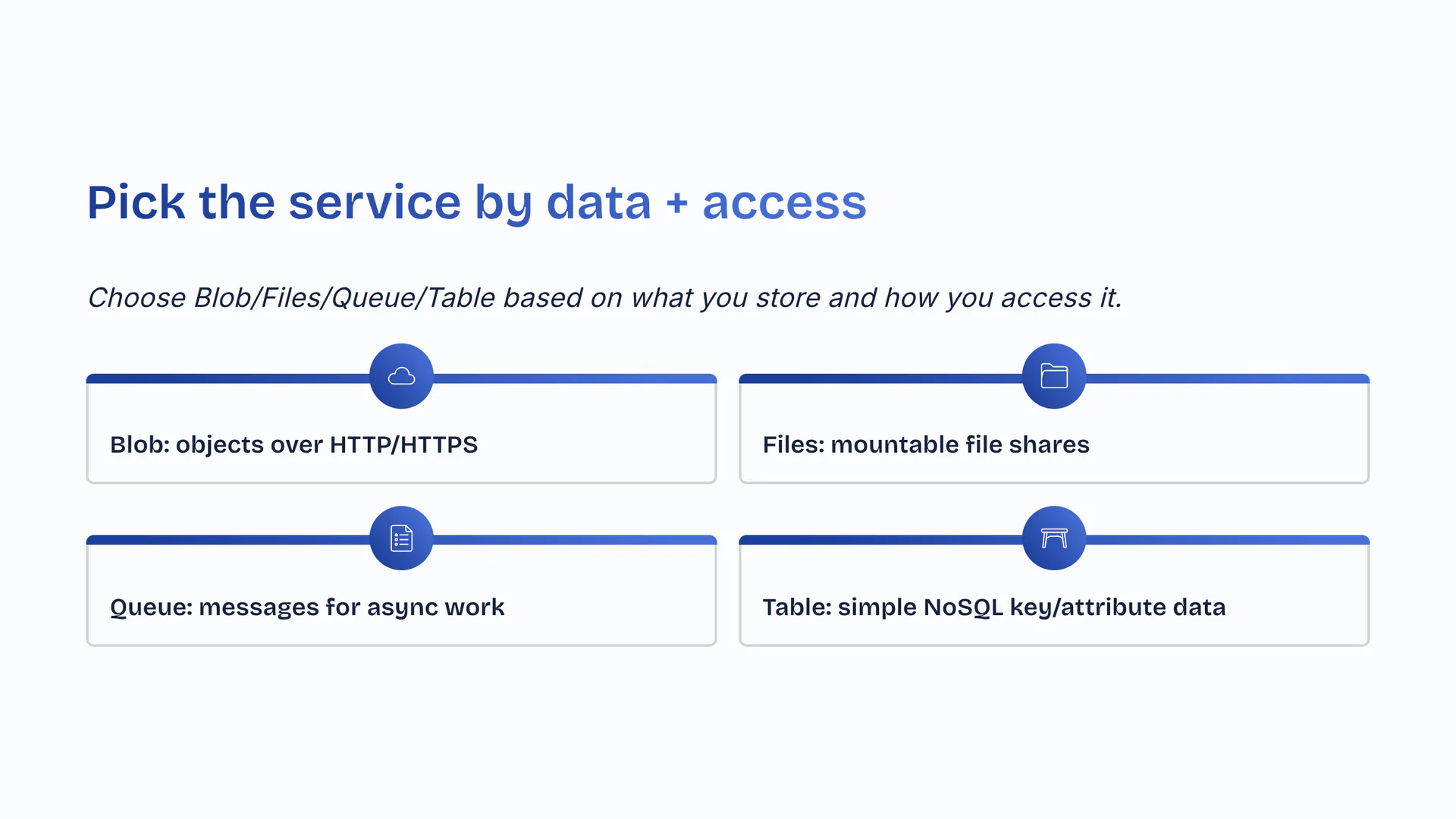Choose Blob/Files/Queue/Table based on what you store and how you access it. Blob: objects over HTTP/HTTPS. Files: mountable file shares. Queue: messages for async work. Table: simple NoSQL key/attribute data.