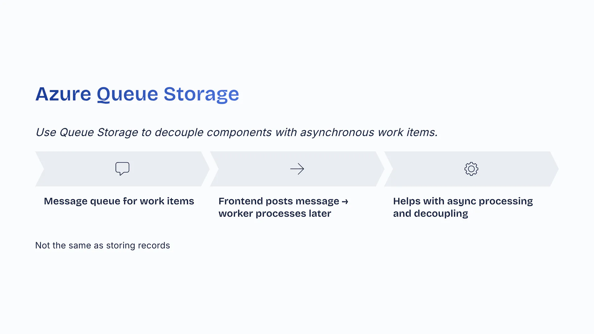 Use Queue Storage to decouple components with asynchronous work items. Message queue for work items. Frontend posts message → worker processes later. Helps with async processing and decoupling. Not the same as storing records.