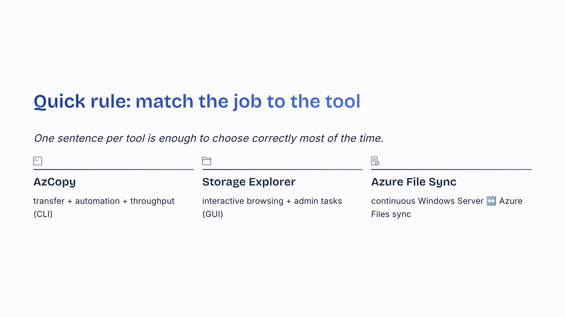 One sentence per tool is enough to choose correctly most of the time. AzCopy → transfer plus automation plus throughput (CLI). Storage Explorer → interactive browsing plus admin tasks (GUI). Azure File Sync → continuous Windows Server ↔ Azure Files sync.