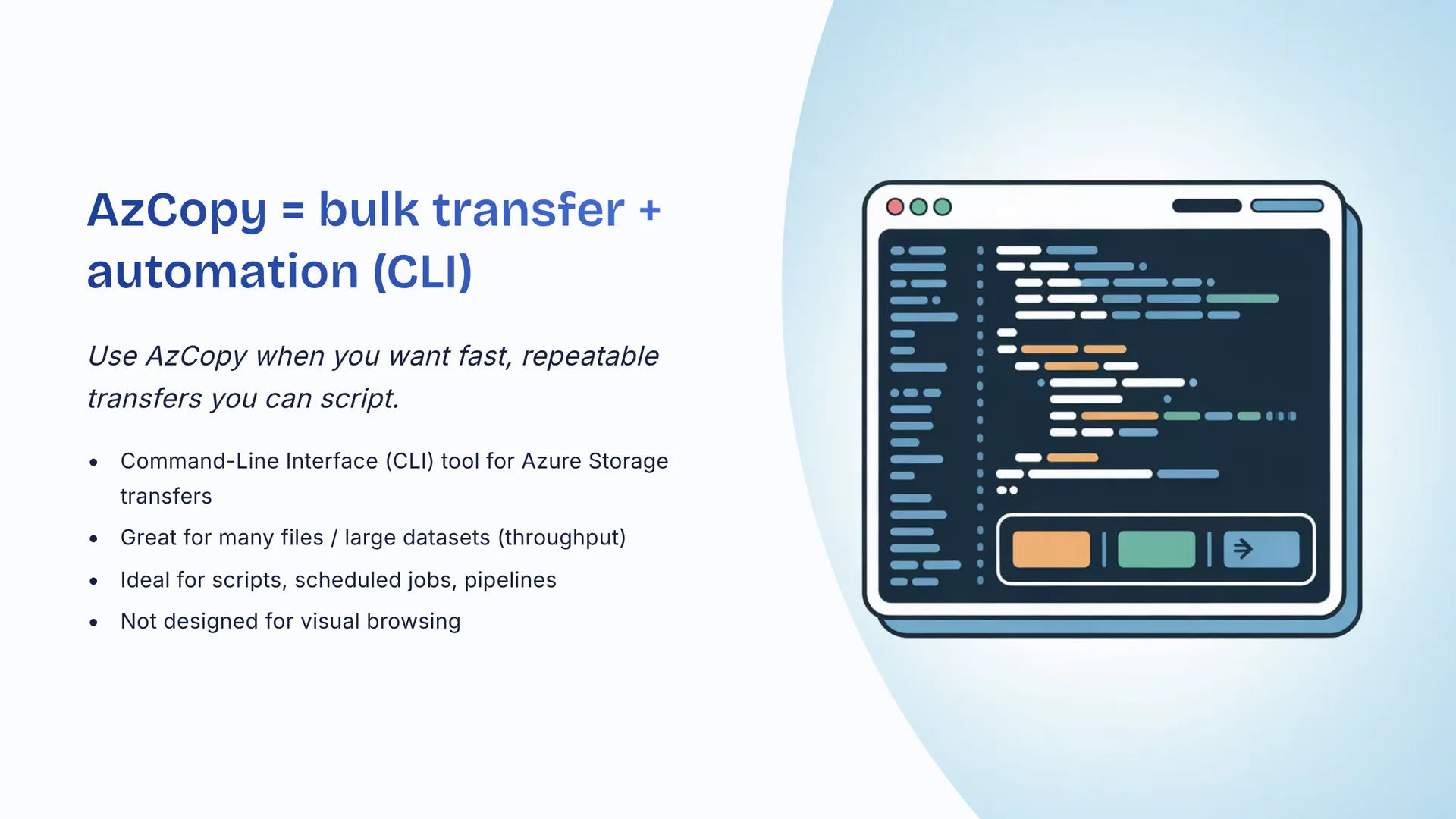 Use AzCopy when you want fast, repeatable transfers you can script. Command-Line Interface (CLI) tool for Azure Storage transfers. Great for many files / large datasets (throughput). Ideal for scripts, scheduled jobs, pipelines. Not designed for visual browsing.