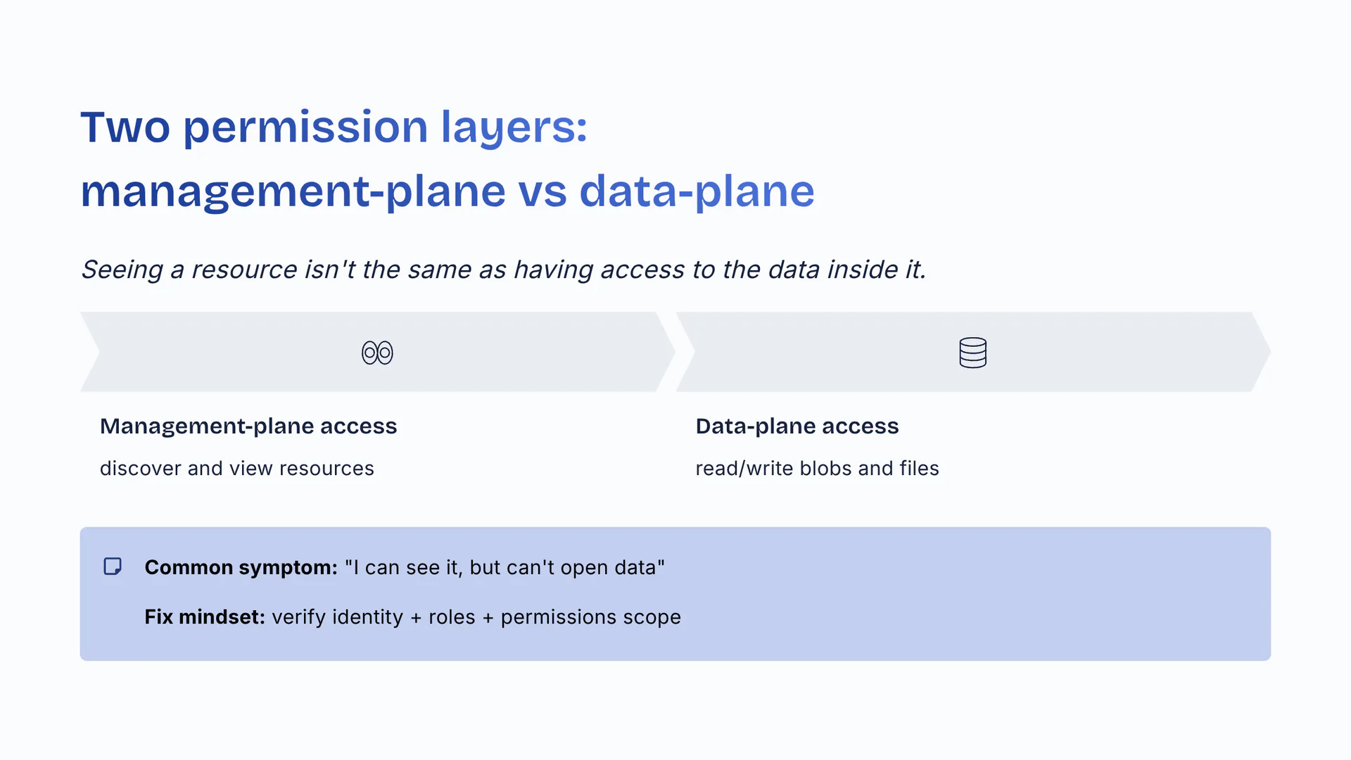 Seeing a resource isn't the same as having access to the data inside it. Management-plane access: discover and view resources. Data-plane access: read/write blobs and files. Common symptom: 'I can see it, but can't open data'. Fix mindset: verify identity plus roles plus permissions scope.
