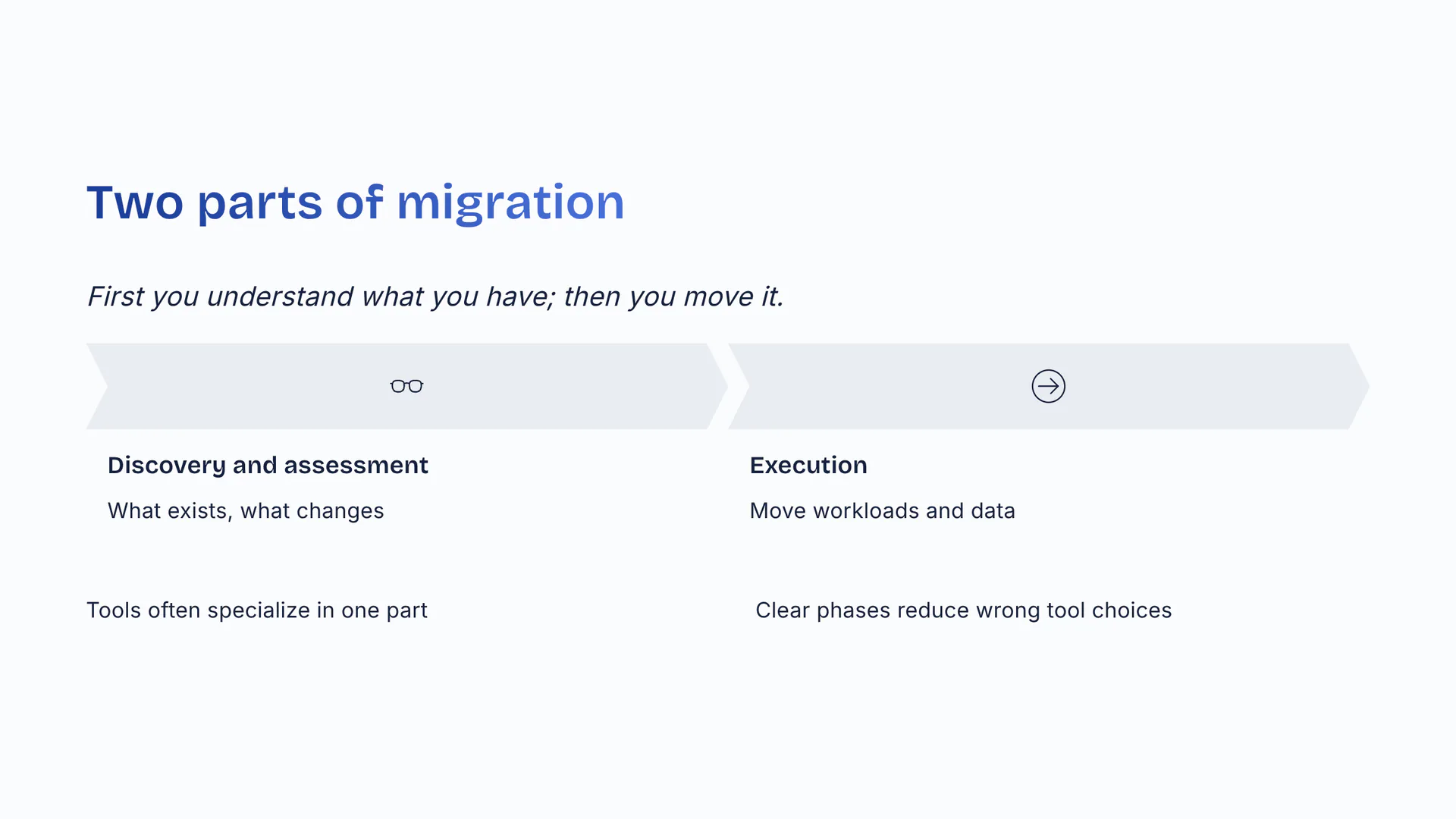 First you understand what you have; then you move it. Discovery and assessment (what exists, what changes). Execution (move workloads and data). Tools often specialize in one part. Clear phases reduce wrong tool choices.