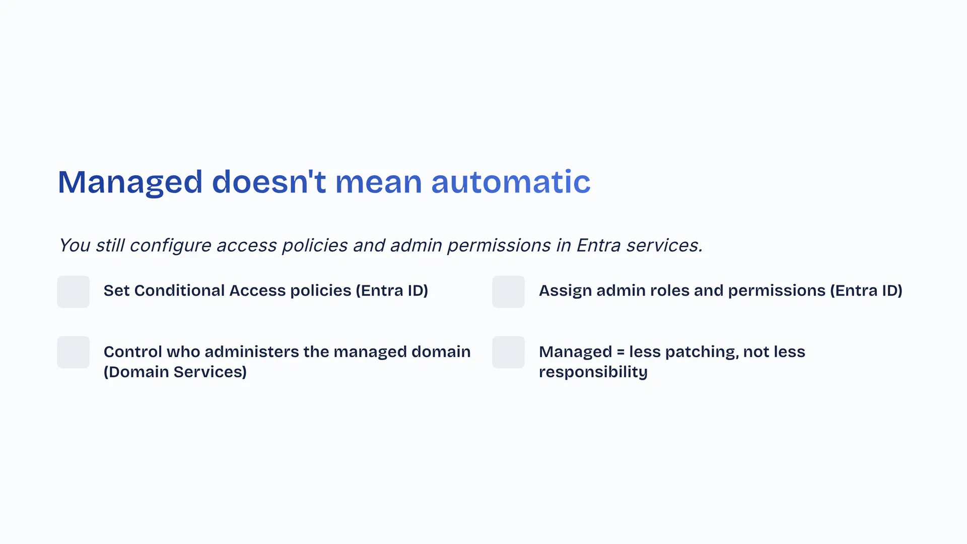 You still configure access policies and admin permissions in Entra services. Set Conditional Access policies (Entra ID). Assign admin roles and permissions (Entra ID). Control who administers the managed domain (Domain Services). Managed equals less patching, not less responsibility.