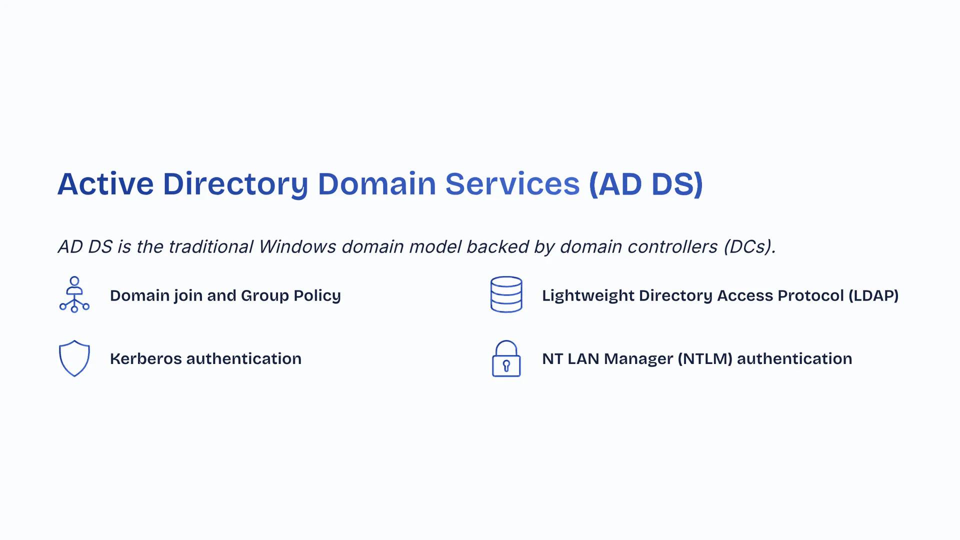 AD DS is the traditional Windows domain model backed by domain controllers (DCs). Domain join and Group Policy. Lightweight Directory Access Protocol (LDAP). Kerberos authentication. NT LAN Manager (NTLM) authentication.