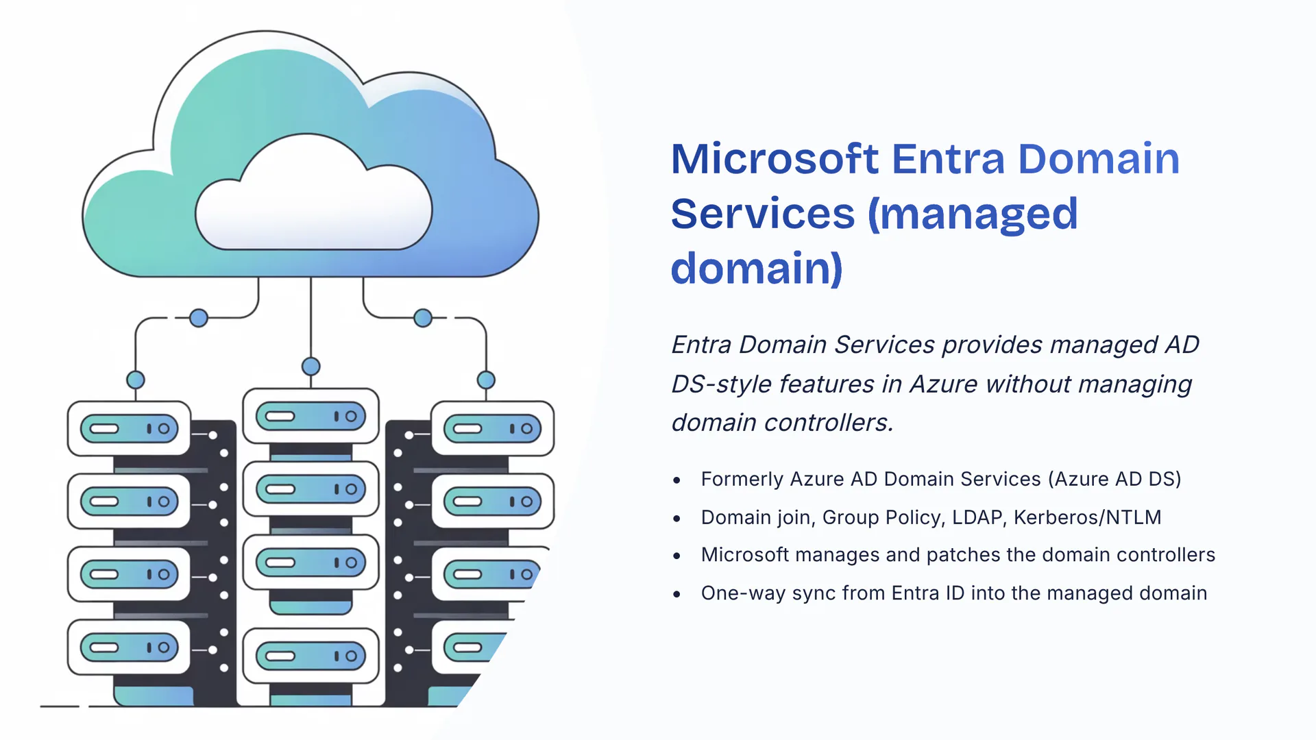 Entra Domain Services provides managed AD DS-style features in Azure without managing domain controllers. Formerly Azure AD Domain Services (Azure AD DS). Domain join, Group Policy, LDAP, Kerberos/NTLM. Microsoft manages and patches the domain controllers. One-way sync from Entra ID into the managed domain.