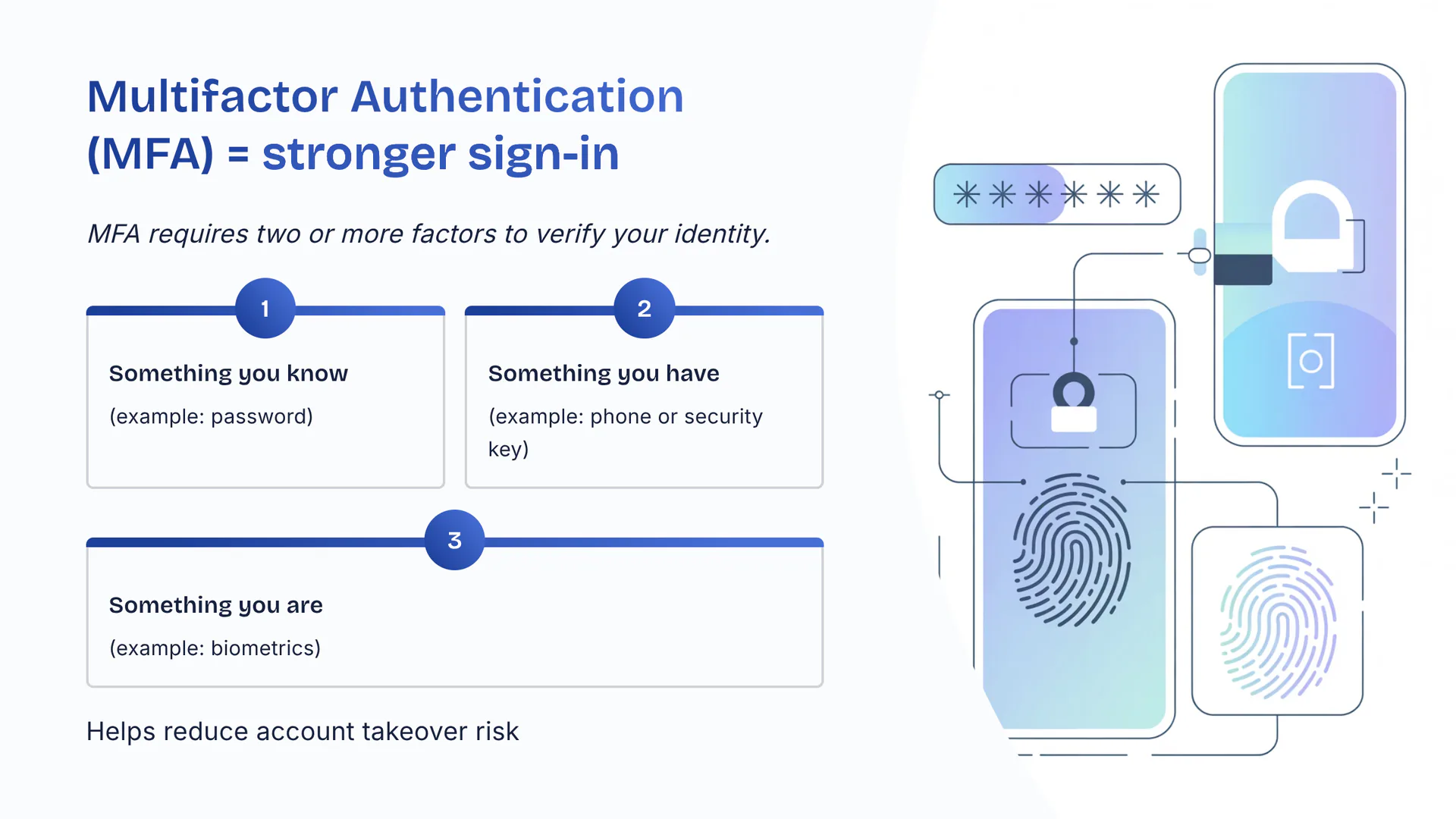 MFA requires two or more factors to verify your identity. Something you know (example: password). Something you have (example: phone or security key). Something you are (example: biometrics). Helps reduce account takeover risk.