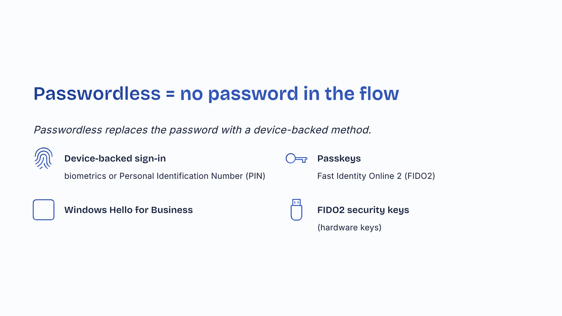 Passwordless replaces the password with a device-backed method. Device-backed sign-in plus biometrics or Personal Identification Number (PIN). Passkeys (Fast Identity Online 2 (FIDO2)). Windows Hello for Business. FIDO2 security keys (hardware keys).