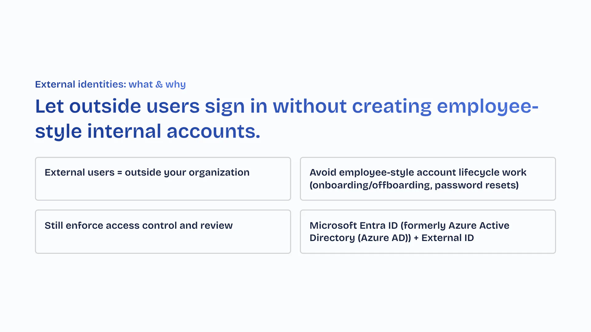 Let outside users sign in without creating employee-style internal accounts. External users equals outside your organization. Avoid employee-style account lifecycle work (onboarding/offboarding, password resets). Still enforce access control and review. Microsoft Entra ID (formerly Azure Active Directory (Azure AD)) plus External ID.