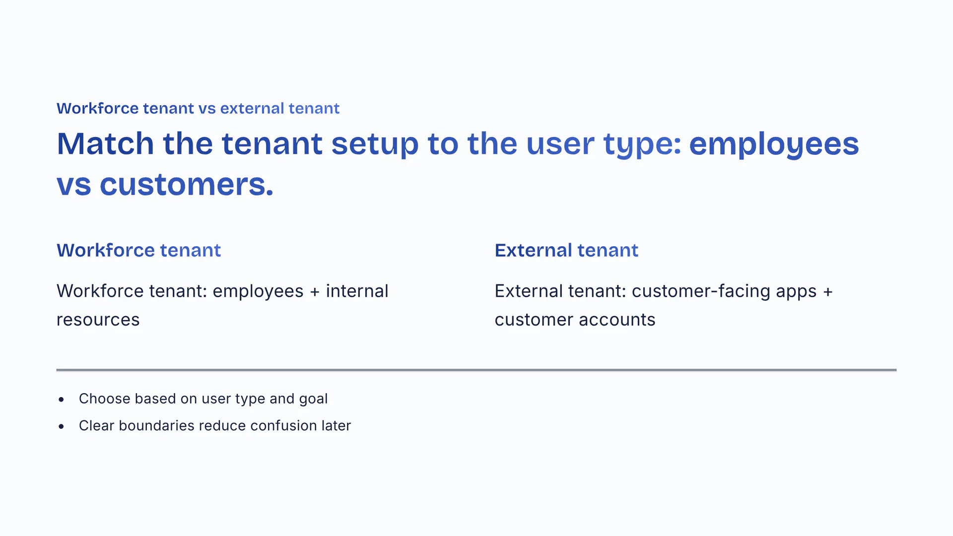 Match the tenant setup to the user type: employees vs customers. Workforce tenant: employees plus internal resources. External tenant: customer-facing apps plus customer accounts. Choose based on user type and goal. Clear boundaries reduce confusion later.