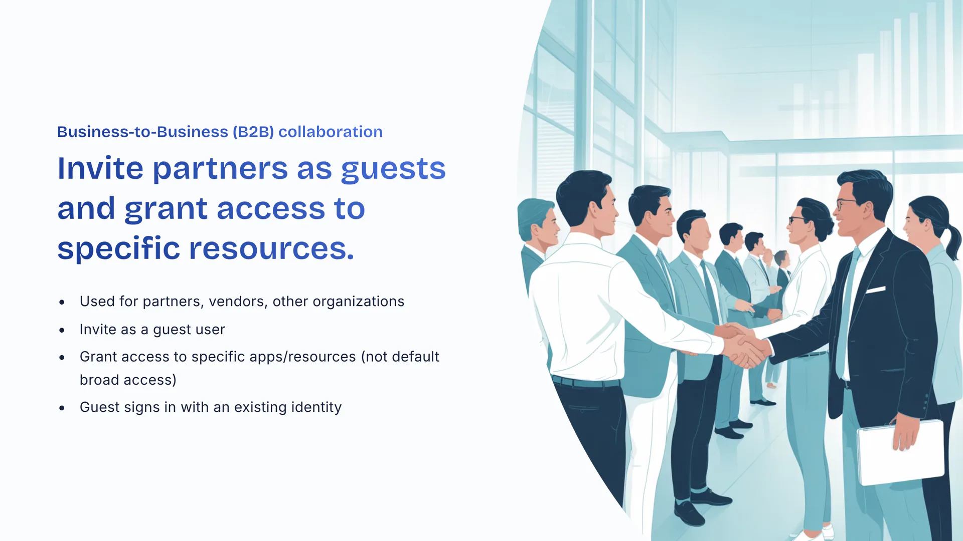 Invite partners as guests and grant access to specific resources. Used for partners, vendors, other organizations. Invite as a guest user. Grant access to specific apps/resources (not default broad access). Guest signs in with an existing identity.