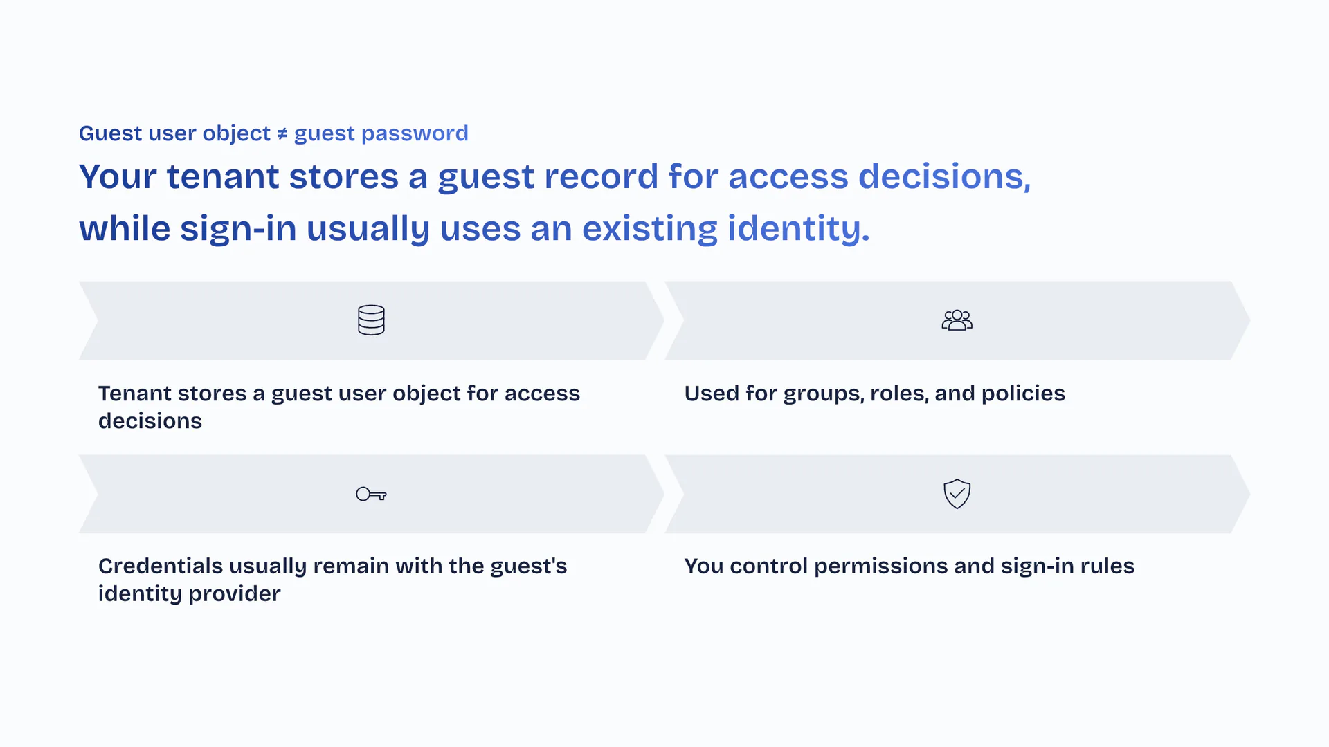 Your tenant stores a guest record for access decisions, while sign-in usually uses an existing identity. Tenant stores a guest user object for access decisions. Used for groups, roles, and policies. Credentials usually remain with the guest's identity provider. You control permissions and sign-in rules.