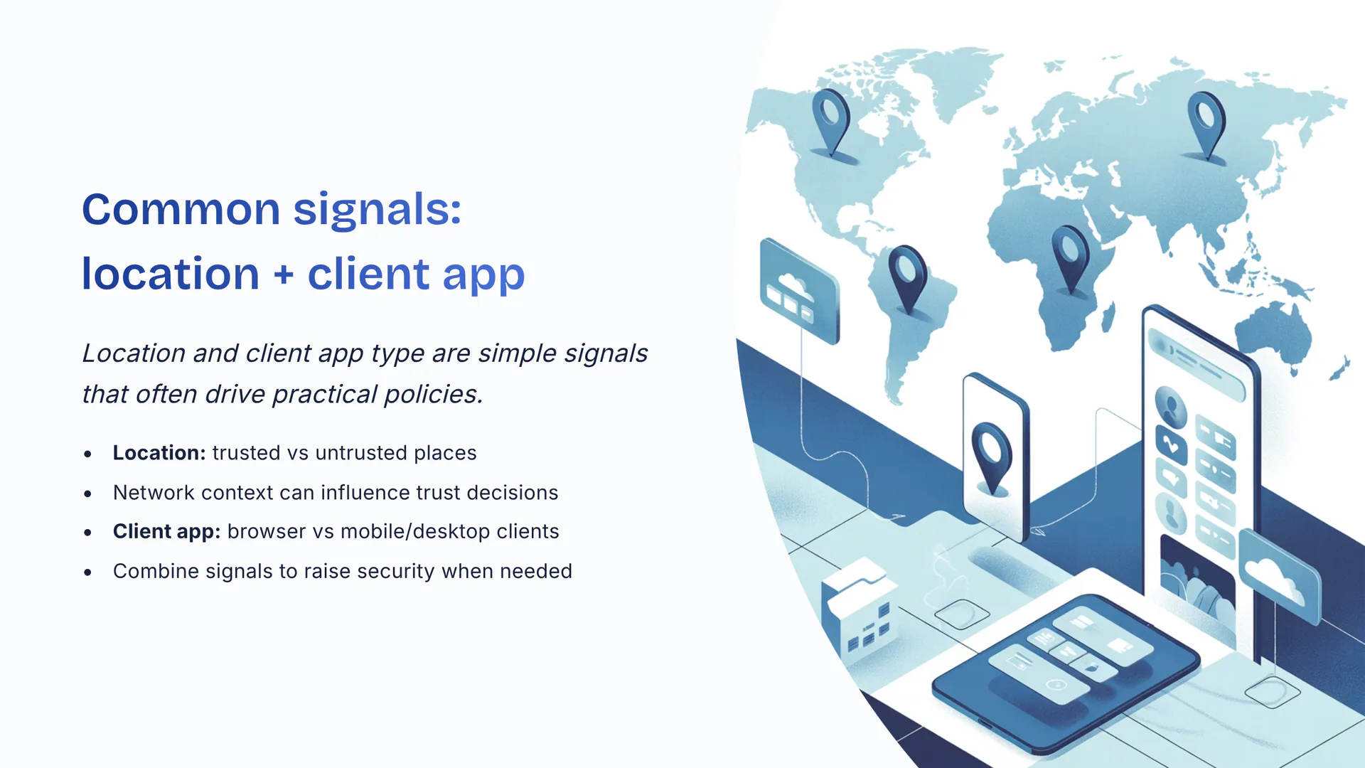 Location and client app type are simple signals that often drive practical policies. Location: trusted vs untrusted places. Network context can influence trust decisions. Client app: browser vs mobile/desktop clients. Combine signals to raise security when needed.